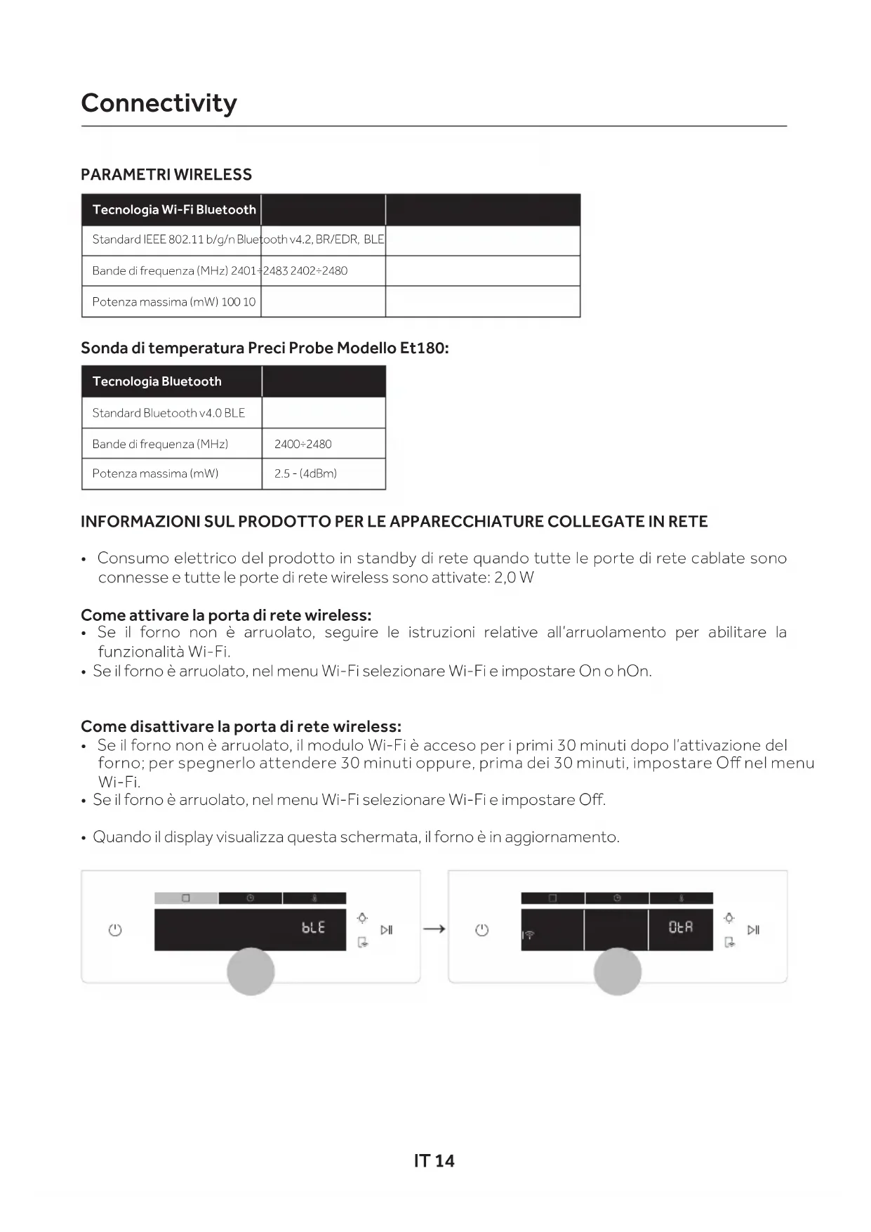 - Quando il display visualizza questa schermata, il forno è in aggiornamento. Sonda di temperatura Preci Probe Modello Et180: Connectivity Tecnologia Wi-Fi Bluetooth Standard IEEE 802.11 b/g/n Bluetooth v4.2, BR/EDR, BLE Bande di frequenza (MHz) 2401÷2483 2402÷2480 Potenza massima (mW) 100 10 Tecnologia Bluetooth Standard Bluetooth v4.0 BLE Bande di frequenza (MHz) 2400÷2480 Potenza massima (mW) 2.5 - (4dBm)IT 15 Arruolamento del forno sull’app SU SMARTPHONE Passo 1