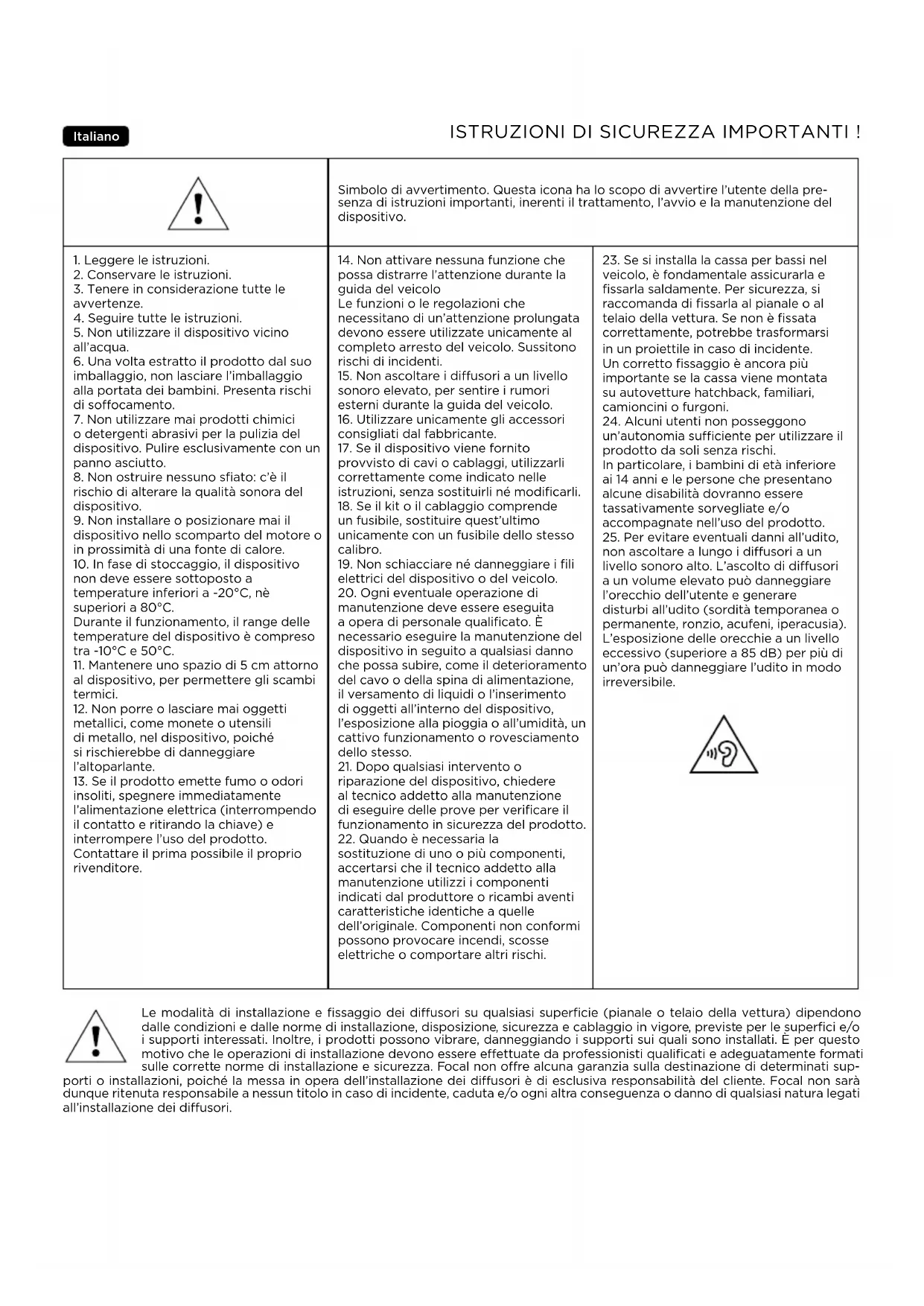 T3Y Istruzioni per l'uso Cruscotto Durante la posa dei ricevitori a vite, accertarsi di non far cadere le viti. Non presentano rischi particolari, ma sono difficili da recuperare. Se occorrono viti di ricambio, procurarsi viti autofilettanti di 5 mm di diametro e 15 mm di lunghezza (M5x15). Vano piedi Non toccare cavi diversi da quelli necessari per l’installazione. Il filtro deve rimanere sempre nel vano piedi. Durante il rimontaggio del vano, rimontare correttamente il rivestimento, in modo che ricopra la tenuta. Manutenzione La manutenzione degli altoparlanti IW T3Y 200, ICC T3Y 100, IS T3Y 100 e IC T3Y 100 si limita allo spolvero con un panno asciutto. Se la griglia si macchia, pulirla con un panno umido. Non utilizzare mai solventi, detergenti, alcol o prodotti corrosivi, raschietti o altri utensili abrasivi per pulire la superficie degli altoparlanti. Periodo di rodaggio Gli altoparlanti IW T3Y 200, ICC T3Y 100, IS T3Y 100 et IC T3Y 100 sono elementi meccanici complessi che richiedono un periodo di adattamento per poter funzionare al meglio delle loro possibilità. Questo periodo di rodaggio varia a seconda delle condizioni specifiche e può durare anche qualche settimana. Per velocizzare questa operazione, tenere in funzione gli altoparlanti per una ventina di ore consecutive, a un livello sonoro medio. Quando le caratteristiche degli altoparlanti si sono completamente stabilizzate, i prodotti offriranno le loro prestazioni ottimali. Condizioni di garanzia Tutti gli altoparlanti Focal sono coperti da garanzia emessa dal distributore ufficiale Focal del tuo paese. Il tuo distributore potrà fornirti tutti i dettagli relativi alle condizioni di garanzia. La copertura della garanzia comprende quanto concesso dalla garanzia legale in forza nel paese in cui è stata emessa la fattura d’acquisto originale.Símbolo de advertencia. Este símbolo se ha diseñado para advertir al usuario de la presencia de instrucciones importantes mencionadas en el manual de usuario y relacionadas con el manejo, funcionamiento y mantenimiento del dispositivo.