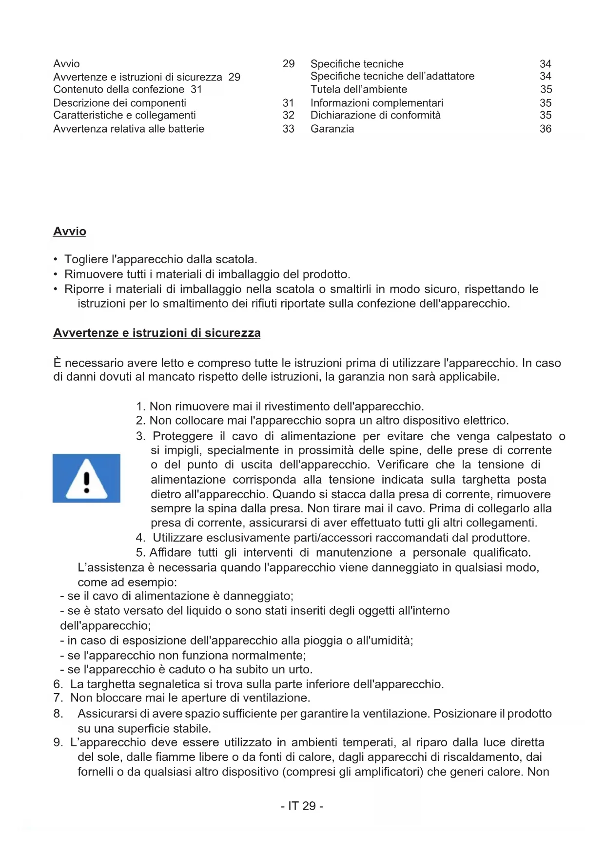 del sole, dalle amme libere o da fonti di calore, dagli apparecchi di riscaldamento, dai fornelli o da qualsiasi altro dispositivo (compresi gli amplicatori) che generi calore. Non Avvio 29 Avvertenze e istruzioni di sicurezza 29 Contenuto della confezione 31 Descrizione dei componenti 31 Caratteristiche e collegamenti 32 Avvertenza relativa alle batterie 33 Speciche tecniche 34 Speciche tecniche dell’adattatore 34 Tutela dell’ambiente 35 Informazioni complementari 35 Dichiarazione di conformità 35 Garanzia 36- IT 30 - deve essere inallato in prossimità di fonti di calore.