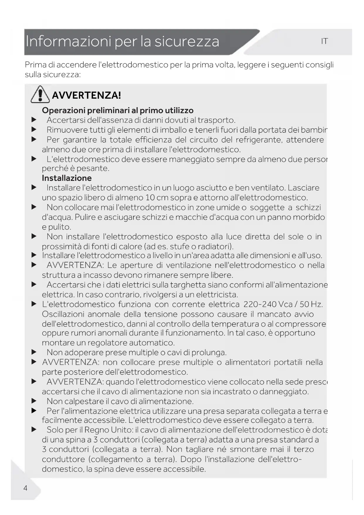 Informazi oni per la sicurezza Prima di accendere l'elettrodomestico per la prima volta, leggere i seguenti consigli sulla sicurezza: AVVERTENZA! Operazioni preliminari al primo utilizzo Accertarsi dell'assenza di danni dovuti al trasporto. Rimuovere tutti gli elementi di imballo e tenerli fuori dalla portata dei bambini. Per garantire la totale efficienza del circuito del refrigerante, attendere almeno due ore prima di installare l'elettrodomestico. L'elettrodomestico deve essere maneggiato sempre da almeno due persone perché è pesante. Installazione Installare l'elettrodomestico in un luogo asciutto e ben ventilato. Lasciare uno spazio libero di almeno 10 cm sopra e attorno all'elettrodomestico. Non collocare mai l'elettrodomestico in zone umide o soggette a schizzi d'acqua. Pulire e asciugare schizzi e macchie d'acqua con un panno morbido e pulito. Non installare l'elettrodomestico esposto alla luce diretta del sole o in prossimità di fonti di calore (ad es. stufe o radiatori). Installare l'elettrodomestico a livello in un'area adatta alle dimensioni e all'uso. AVVERTENZA: Le aperture di ventilazione nell'elettrodomestico o nella struttura a incasso devono rimanere sempre libere. Accertarsi che i dati elettrici sulla targhetta siano conformi all'alimentazione elettrica. In caso contrario, rivolgersi a un elettricista. L'elettrodomestico funziona con corrente elettrica 220-240 Vca / 50 Hz. Oscillazioni anomale della tensione possono causare il mancato avvio dell'elettrodomestico, danni al controllo della temperatura o al compressore oppure rumori anomali durante il funzionamento. In tal caso, è opportuno montare un regolatore automatico. Non adoperare prese multiple o cavi di prolunga. AVVERTENZA: non collocare prese multiple o alimentatori portatili nella parte posteriore dell'elettrodomestico. AVVERTENZA: quando l'elettrodomestico viene collocato nella sede prescelta, accertarsi che il cavo di alimentazione non sia incastrato o danneggiato. Non calpestare il cavo di alimentazione. Per l'alimentazione elettrica utilizzare una presa separata collegata a terra e facilmente accessibile. L'elettrodomestico deve essere collegato a terra. Solo per il Regno Unito: il cavo di alimentazione dell'elettrodomestico è dotato di una spina a 3 conduttori (collegata a terra) adatta a una presa standard a 3 conduttori (collegata a terra). Non tagliare né smontare mai il terzo conduttore (collegamento a terra). Dopo l'installazione dell'elettro- domestico, la spina deve essere accessibile.IT Informazioni per la sicurezza