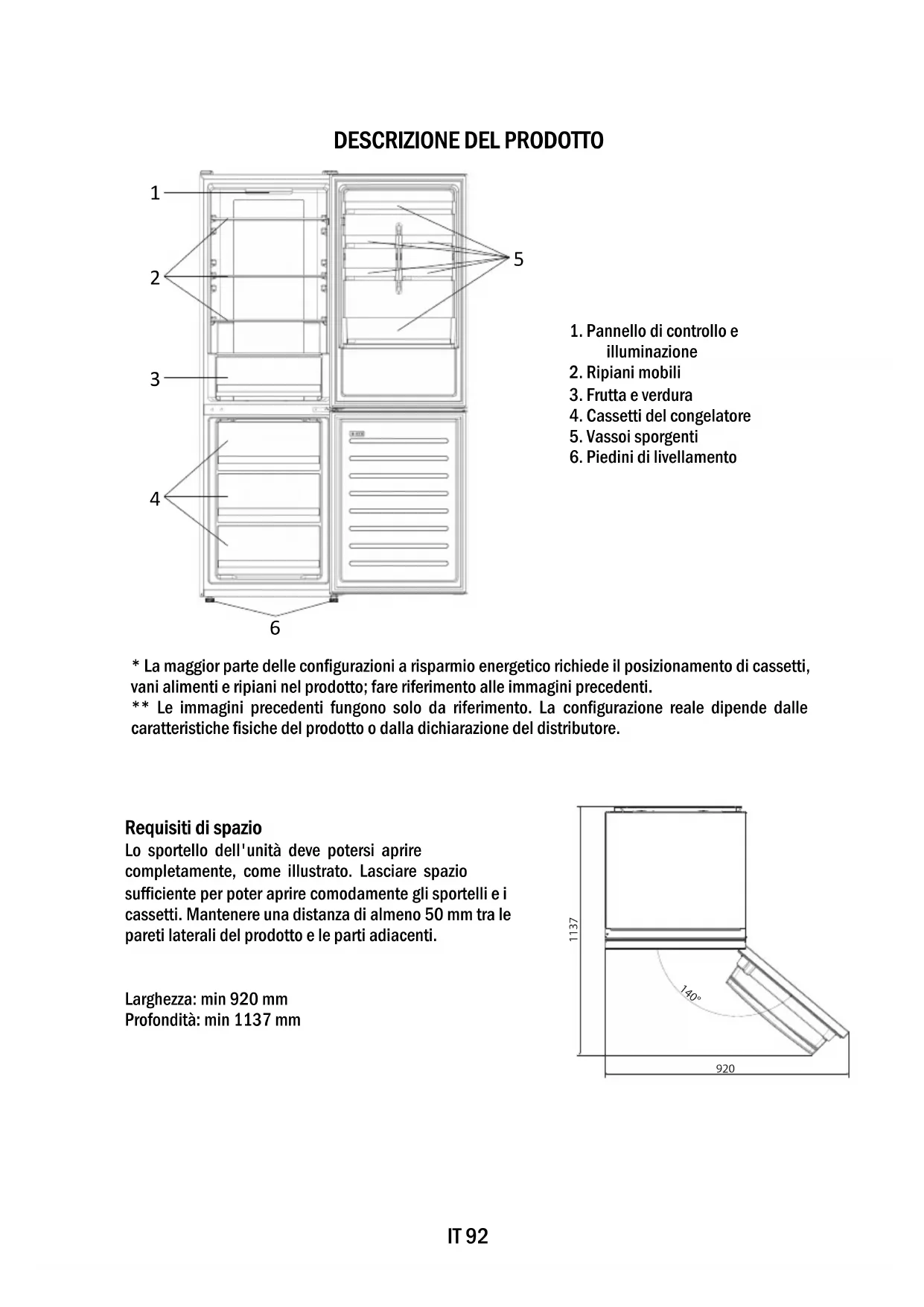 - La maggior parte delle configurazioni a risparmio energetico richiede il posizionamento di cassetti, vani alimenti e ripiani nel prodotto; fare riferimento alle immagini precedenti. ** Le immagini precedenti fungono solo da riferimento. La configurazione reale dipende dalle caratteristiche fisiche del prodotto o dalla dichiarazione del distributore. Requisiti di spazio Lo sportello dell'unità deve potersi aprire completamente, come illustrato. Lasciare spazio sufficiente per poter aprire comodamente gli sportelli e i cassetti. Mantenere una distanza di almeno 50 mm tra le pareti laterali del prodotto e le parti adiacenti. Larghezza: min 920 mm Profondità: min 1137 mm