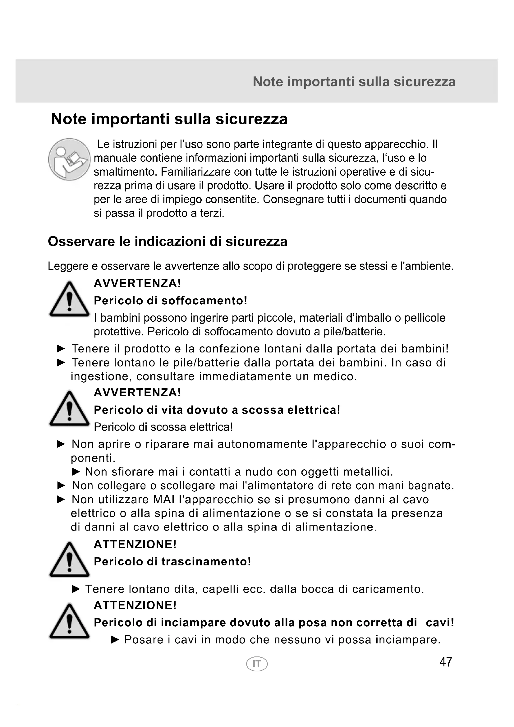 Note importanti sulla sicurezza Le istruzioni per l‘uso sono parte integrante di questo apparecchio. Il manuale contiene informazioni importanti sulla sicurezza, l‘uso e lo smaltimento. Familiarizzare con tutte le istruzioni operative e di sicu- rezza prima di usare il prodotto. Usare il prodotto solo come descritto e per le aree di impiego consentite. Consegnare tutti i documenti quando si passa il prodotto a terzi. Osservare le indicazioni di sicurezza Leggere e osservare le avvertenze allo scopo di proteggere se stessi e l'ambiente. AVVERTENZA! Pericolo di soffocamento! I bambini possono ingerire parti piccole, materiali d’imballo o pellicole protettive. Pericolo di soocamento dovuto a pile/batterie. ► Tenere il prodotto e la confezione lontani dalla portata dei bambini! ► Tenere lontano le pile/batterie dalla portata dei bambini. In caso di ingestione, consultare immediatamente un medico. AVVERTENZA! Pericolo di vita dovuto a scossa elettrica! Pericolo di scossa elettrica! ► Non aprire o riparare mai autonomamente l'apparecchio o suoi com- ponenti. ► Non sfiorare mai i contatti a nudo con oggetti metallici. ► Non collegare o scollegare mai l'alimentatore di rete con mani bagnate. ► Non utilizzare MAI l'apparecchio se si presumono danni al cavo elettrico o alla spina di alimentazione o se si constata la presenza di danni al cavo elettrico o alla spina di alimentazione. ATTENZIONE! Pericolo di trascinamento! ► Tenere lontano dita, capelli ecc. dalla bocca di caricamento. ATTENZIONE! Pericolo di inciampare dovuto alla posa non corretta di cavi! ► Posare i cavi in modo che nessuno vi possa inciampare.Note importanti sulla sicurezza