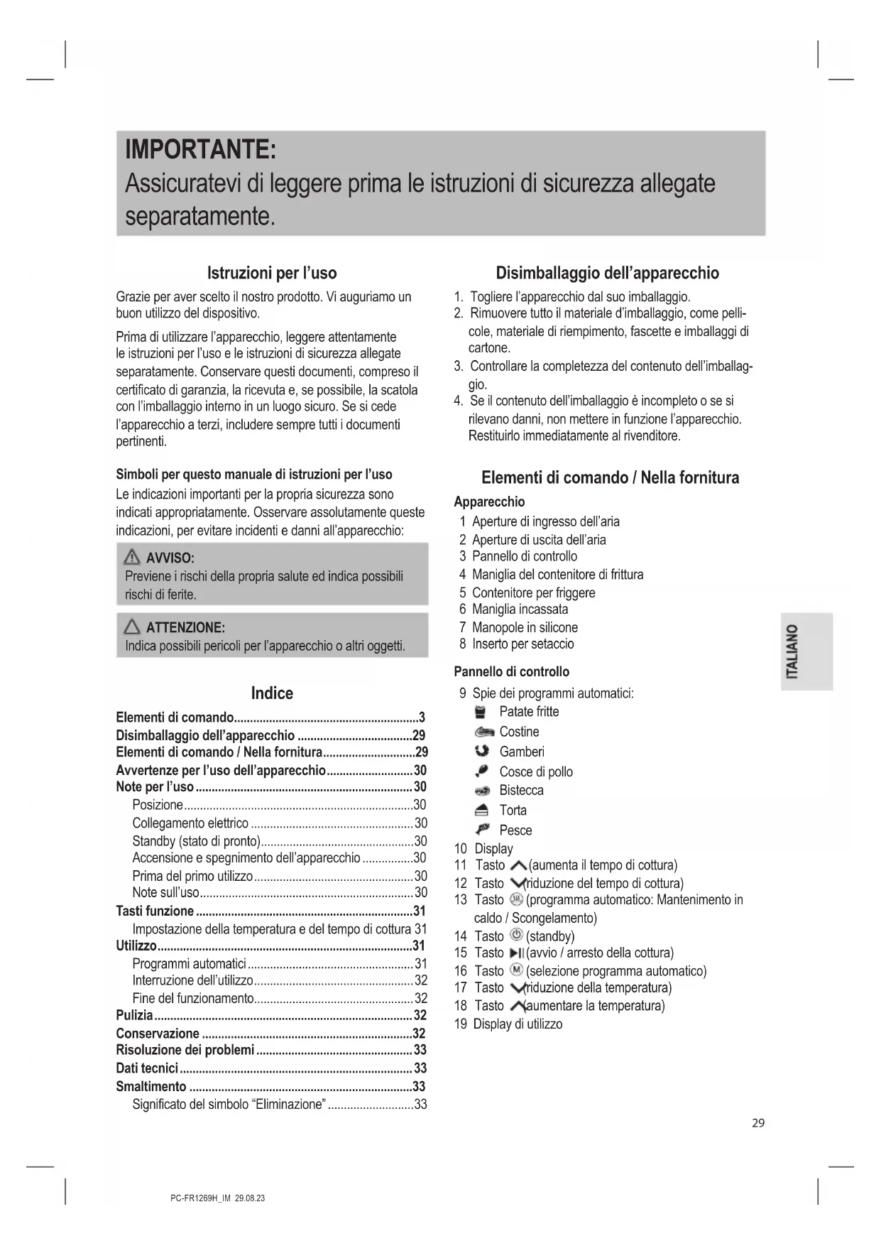 rilevano danni, non mettere in funzione l’apparecchio. Restituirlo immediatamente al rivenditore. Elementi di comando / Nella fornitura Apparecchio 1 Aperture di ingresso dell’aria 2 Aperture di uscita dell’aria 3 Pannello di controllo 4 Maniglia del contenitore di frittura 5 Contenitore per friggere 6 Maniglia incassata 7 Manopole in silicone 8 Inserto per setaccio Pannello di controllo 9 Spie dei programmi automatici: Patate fritte Costine Gamberi Cosce di pollo Bistecca Torta Pesce 10 Display 11 Tasto (aumenta il tempo di cottura) 12 Tasto (riduzione del tempo di cottura) 13 Tasto (programma automatico: Mantenimento in caldo / Scongelamento) 14 Tasto (standby) 15 Tasto (avvio / arresto della cottura) 16 Tasto (selezione programma automatico) 17 Tasto (riduzione della temperatura) 18 Tasto (aumentare la temperatura) 19 Display di utilizzoPC-FR1269H_IM 29.08.23