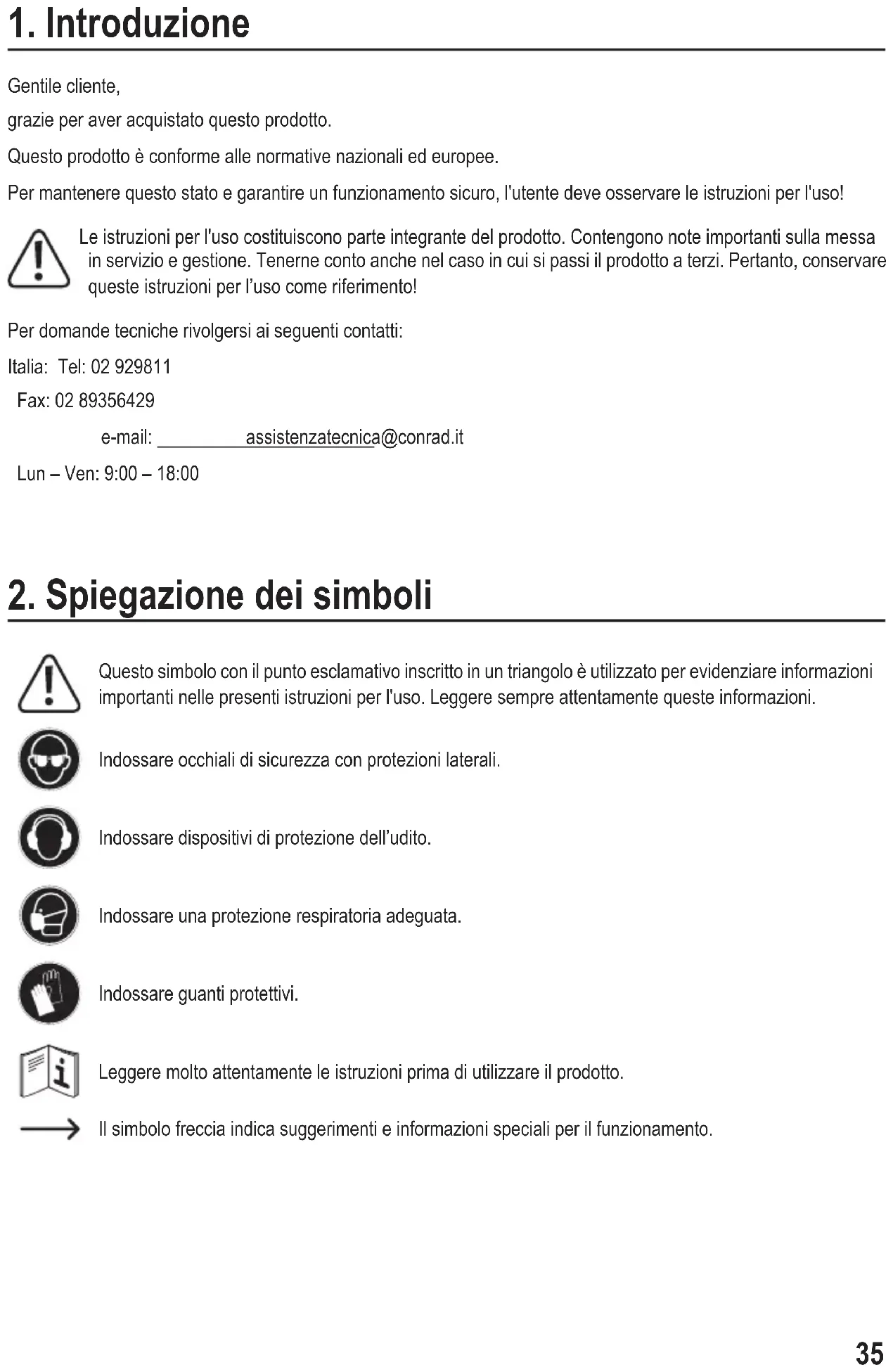 Gentile cliente, grazie per aver acquistato questo prodotto. Questo prodotto è conforme alle normative nazionali ed europee. Per mantenere questo stato e garantire un funzionamento sicuro, l'utente deve osservare le istruzioni per l'uso! Le istruzioni per l'uso costituiscono parte integrante del prodotto. Contengono note importanti sulla messa in servizio e gestione. Tenerne conto anche nel caso in cui si passi il prodotto a terzi. Pertanto, conservare queste istruzioni per l’uso come riferimento! Per domande tecniche rivolgersi ai seguenti contatti: Italia: Tel: 02 929811 Fax: 02 89356429 e-mail: assistenzatecnica@conrad.it Lun – Ven: 9:00 – 18:00