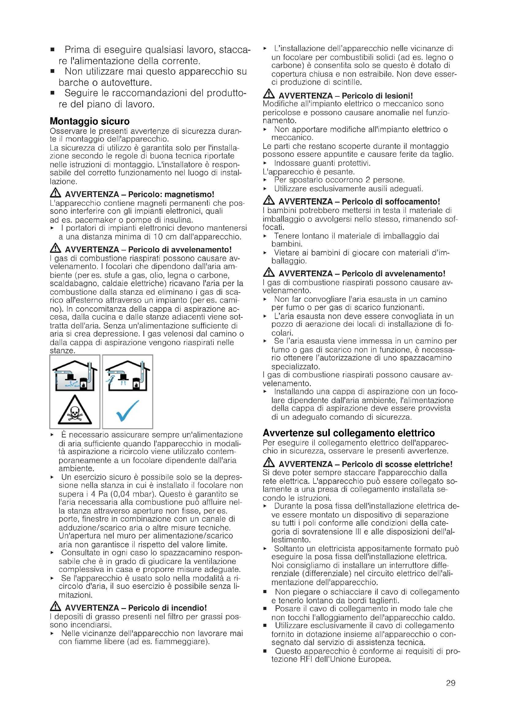 Avvertenze generali ¡ Leggere attentamente le presenti istruzio- ni. ¡ Il collegamento può essere eseguito esclusivamente da un tecnico specializza- to autorizzato.29 ¡ Prima di eseguire qualsiasi lavoro, stacca- re l'alimentazione della corrente. ¡ Non utilizzare mai questo apparecchio su barche o autovetture. ¡ Seguire le raccomandazioni del produtto- re del piano di lavoro. Montaggio sicuro Osservare le presenti avvertenze di sicurezza duran- te il montaggio dell'apparecchio. La sicurezza di utilizzo è garantita solo per l'installa- zione secondo le regole di buona tecnica riportate nelle istruzioni di montaggio. L'installatore è respon- sabile del corretto funzionamento nel luogo di instal- lazione. AVVERTENZA‒Pericolo: magnetismo! L'apparecchio contiene magneti permanenti che pos- sono interferire con gli impianti elettronici, quali ades. pacemaker o pompe di insulina. ▶ I portatori di impianti elettronici devono mantenersi a una distanza minima di 10cm dall'apparecchio. AVVERTENZA‒Pericolo di avvelenamento! I gas di combustione riaspirati possono causare av- velenamento. I focolari che dipendono dall'aria am- biente (per es. stufe a gas, olio, legna o carbone, scaldabagno, caldaie elettriche) ricavano l'aria per la combustione dalla stanza ed eliminano i gas di sca- rico all'esterno attraverso un impianto (per es. cami- no). In concomitanza della cappa di aspirazione ac- cesa, dalla cucina e dalle stanze adiacenti viene sot- tratta dell'aria. Senza un'alimentazione sufficiente di aria si crea depressione. I gas velenosi dal camino o dalla cappa di aspirazione vengono riaspirati nelle stanze. ▶ È necessario assicurare sempre un'alimentazione di aria sufficiente quando l'apparecchio in modali- tà aspirazione a ricircolo viene utilizzato contem- poraneamente a un focolare dipendente dall'aria ambiente. ▶ Un esercizio sicuro è possibile solo se la depres- sione nella stanza in cui è installato il focolare non supera i 4 Pa (0,04 mbar). Questo è garantito se l'aria necessaria alla combustione può affluire nel- la stanza attraverso aperture non fisse, per es. porte, finestre in combinazione con un canale di adduzione/scarico aria o altre misure tecniche. Un'apertura nel muro per alimentazione/scarico aria non garantisce il rispetto del valore limite. ▶ Consultate in ogni caso lo spazzacamino respon- sabile che è in grado di giudicare la ventilazione complessiva in casa e proporre misure adeguate. ▶ Se l'apparecchio è usato solo nella modalità a ri- circolo d'aria, il suo esercizio è possibile senza li- mitazioni. AVVERTENZA‒Pericolo di incendio! I depositi di grasso presenti nel filtro per grassi pos- sono incendiarsi. ▶ Nelle vicinanze dell'apparecchio non lavorare mai con fiamme libere (ad es. fiammeggiare). ▶ L’installazione dell’apparecchio nelle vicinanze di un focolare per combustibili solidi (ad es. legno o carbone) è consentita solo se questo è dotato di copertura chiusa e non estraibile. Non deve esser- ci produzione di scintille. AVVERTENZA‒Pericolo di lesioni! Modifiche all'impianto elettrico o meccanico sono pericolose e possono causare anomalie nel funzio- namento. ▶ Non apportare modifiche all'impianto elettrico o meccanico. Le parti che restano scoperte durante il montaggio possono essere appuntite e causare ferite da taglio. ▶ Indossare guanti protettivi. L'apparecchio è pesante. ▶ Per spostarlo occorrono 2 persone. ▶ Utilizzare esclusivamente ausili adeguati. AVVERTENZA‒Pericolo di soffocamento! I bambini potrebbero mettersi in testa il materiale di imballaggio o avvolgersi nello stesso, rimanendo sof- focati. ▶ Tenere lontano il materiale di imballaggio dai bambini. ▶ Vietare ai bambini di giocare con materiali d’im- ballaggio. AVVERTENZA‒Pericolo di avvelenamento! I gas di combustione riaspirati possono causare av- velenamento. ▶ Non far convogliare l'aria esausta in un camino per fumo o per gas di scarico funzionanti. ▶ L’aria esausta non deve essere convogliata in un pozzo di aerazione dei locali di installazione di fo- colari. ▶ Se l’aria esausta viene immessa in un camino per fumo o gas di scarico non in funzione, è necessa- rio ottenere l’autorizzazione di uno spazzacamino specializzato. I gas di combustione riaspirati possono causare av- velenamento. ▶ Installando una cappa di aspirazione con un foco- lare dipendente dall'aria ambiente, l'alimentazione della cappa di aspirazione deve essere provvista di un adeguato comando di sicurezza. Avvertenze sul collegamento elettrico Per eseguire il collegamento elettrico dell'apparec- chio in sicurezza, osservare le presenti avvertenze. AVVERTENZA‒Pericolo di scosse elettriche! Si deve poter sempre staccare l'apparecchio dalla rete elettrica. L'apparecchio può essere collegato so- lamente a una presa di collegamento installata se- condo le istruzioni. ▶ Durante la posa fissa dell'installazione elettrica de- ve essere montato un dispositivo di separazione su tutti i poli conforme alle condizioni della cate- goria di sovratensione III e alle disposizioni dell'al- lestimento. ▶ Soltanto un elettricista appositamente formato può eseguire la posa fissa dell'installazione elettrica. Noi consigliamo di installare un interruttore diffe- renziale (differenziale) nel circuito elettrico dell'ali- mentazione dell'apparecchio. ¡ Non piegare o schiacciare il cavo di collegamento e tenerlo lontano da bordi taglienti. ¡ Posare il cavo di collegamento in modo tale che non tocchi l'alloggiamento dell'apparecchio caldo. ¡ Utilizzare esclusivamente il cavo di collegamento fornito in dotazione insieme all'apparecchio o con- segnato dal servizio di assistenza tecnica. ¡ Questo apparecchio è conforme ai requisiti di pro- tezione RFI dell’Unione Europea.30 ¡ L'apparecchio appartiene alla classe di protezione 1 e deve essere utilizzato solo se dotato di un conduttore di terra. ¡ Il costruttore non si assume alcuna responsabilità per eventuali guasti 