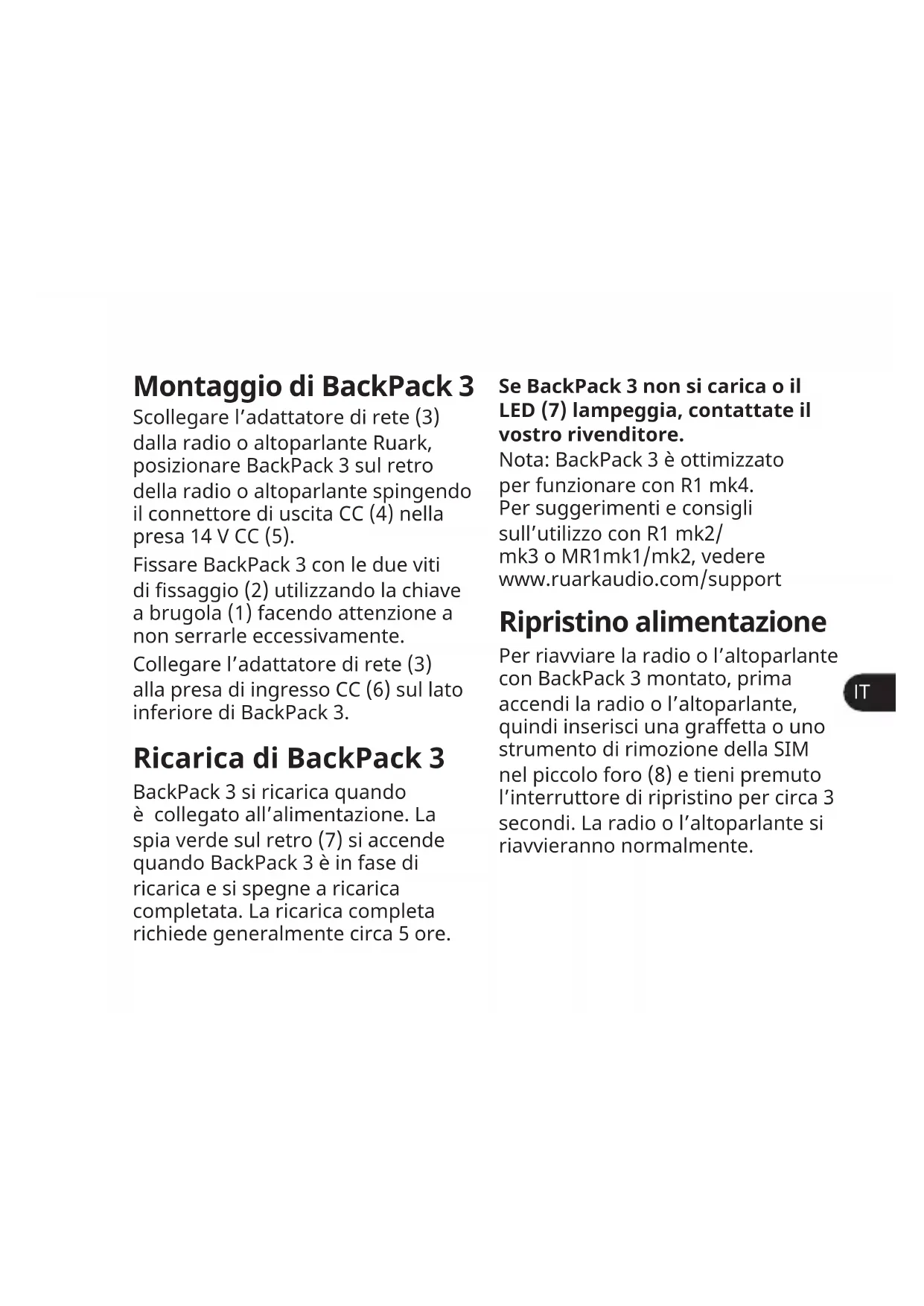 Montaggio di BackPack 3 Scollegare l’adattatore di rete (3) dalla radio o altoparlante Ruark, posizionare BackPack 3 sul retro della radio o altoparlante spingendo il connettore di uscita CC (4) nella presa 14 V CC (5). Fissare BackPack 3 con le due viti di ssaggio (2) utilizzando la chiave a brugola (1) facendo attenzione a non serrarle eccessivamente. Collegare l’adattatore di rete (3) alla presa di ingresso CC (6) sul lato inferiore di BackPack 3. Ricarica di BackPack 3 BackPack 3 si ricarica quando è collegato all’alimentazione. La spia verde sul retro (7) si accende quando BackPack 3 è in fase di ricarica e si spegne a ricarica completata. La ricarica completa richiede generalmente circa 5 ore. Se BackPack 3 non si carica o il LED (7) lampeggia, contattate il vostro rivenditore. Nota: BackPack 3 è ottimizzato per funzionare con R1 mk4. Per suggerimenti e consigli sull’utilizzo con R1 mk2/ mk3 o MR1mk1/mk2, vedere www.ruarkaudio.com/support Ripristino alimentazione Per riavviare la radio o l’altoparlante con BackPack 3 montato, prima accendi la radio o l’altoparlante, quindi inserisci una graffetta o uno strumento di rimozione della SIM nel piccolo foro (8) e tieni premuto l’interruttore di ripristino per circa 3 secondi. La radio o l’altoparlante si riavvieranno normalmente.Informazioni sulla sicurezza