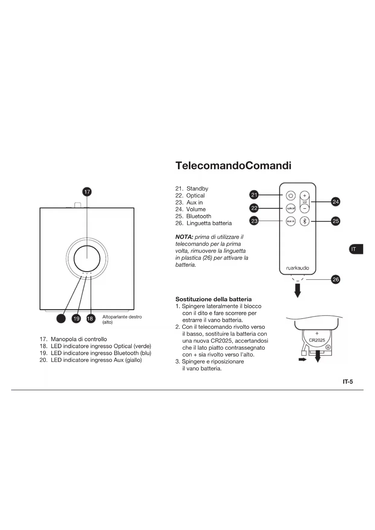 - Alimentazione in uscita 14 V CC 2.0A Speciche e design soggetti a modiche senza preavvisoGaranzia Registrare il prodotto per ottenere una garanzia estesa di tre anni. Come standard, questo prodotto è garantito privo di difetti per un periodo di due anni dalla data di acquisto, ma questo è esteso a tre anni se si registra il prodotto su www.ruarkaudio.com. Questa garanzia rimane valida a condizione che questo prodotto sia stato trattato con la dovuta cura e attenzione. Il guasto del prodotto a causa di danni accidentali, usura eccessiva, negligenza o modica non autorizzata annullerà questa garanzia. Per i prodotti acquistati al di fuori del Regno Unito, il distributore nel paese di acquisto garantisce il prodotto. Per i dettagli, contattare il distributore o il punto vendita Ruark di zona. Se si restituisce questo prodotto, assicurarsi che sia imballato nella sua confezione originale e che sia inclusa una prova di acquisto. Questa garanzia non varia in alcun modo o rimuove i diritti legali dell’acquirente. Salvo errori ed omissioni. Manutenzione generale ● Pulire il dispositivo con un panno morbido che non lasci pelucchi oppure con un panno leggermente umido. Non utilizzare cera spray o altre sostanze che potrebbero danneggiare la nitura superciale o compromettere le prestazioni. ● Non esporre il dispositivo a luce solare diretta, elevata umidità, polvere, eccessive vibrazioni o temperature estreme onde evitare di comprometterne la nitura, le prestazioni e l'afdabilità. ● Il range della temperatura d'esercizio consigliata è compreso tra 5°C e 40°C. ● Le strutture con nitura in legno naturale possono cambiare e schiarirsi o scurirsi con il passare del tempo, specialmente se esposte alla luce del sole. Copyright e marchi © Ruark Audio. Tutti i diritti riservati. Ruark Audio, il logo Ruark Audio e altri marchi Ruark Audio sono di proprietà di Ruark Audio e potrebbero essere registrati. Tutti gli altri marchi sono proprietà dei rispettivi proprietari. Ruark Audio non si assume alcuna responsabilità per eventuali errori riscontrabili nel presente manuale e le informazioni ivi contenute potranno essere modicate senza preavviso. Bluetooth® e i loghi associati sono marchi registrati di proprietà di Bluetooth SIG, Inc. Qualcomm aptX è un prodotto di Qualcomm Technologies International Ltd. Tutti gli altri marchi sono proprietà dei rispettivi proprietari.User guide Brugervejledning Bedienungsanleitung Guía del usuario Guide de l’utilisateur Manuale dell’utente