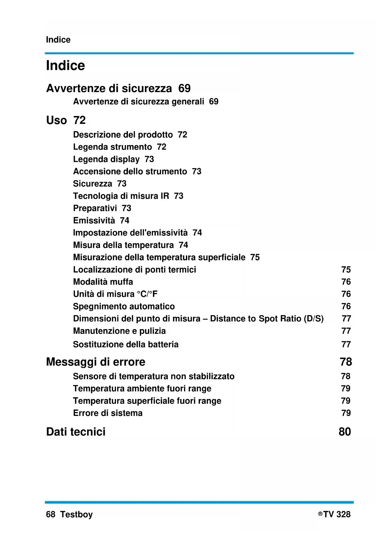 TV 328 Indice Avvertenze di sicurezza 69 Avvertenze di sicurezza generali 69 Uso 72 Descrizione del prodotto 72 Legenda strumento 72 Legenda display 73 Accensione dello strumento 73 Sicurezza 73 Tecnologia di misura IR 73 Preparativi 73 Emissività 74 Impostazione dell'emissività 74 Misura della temperatura 74 Misurazione della temperatura superficiale 75 Localizzazione di ponti termici 75 Modalità muffa 76 Unità di misura °C/°F 76 Spegnimento automatico 76 Dimensioni del punto di misura – Distance to Spot Ratio (D/S) 77 Manutenzione e pulizia 77 Sostituzione della batteria 77 Messaggi di errore 78 Sensore di temperatura non stabilizzato 78 Temperatura ambiente fuori range 79 Temperatura superficiale fuori range 79 Errore di sistema 79 Dati tecnici 80Avvertenze di sicurezza Testboy