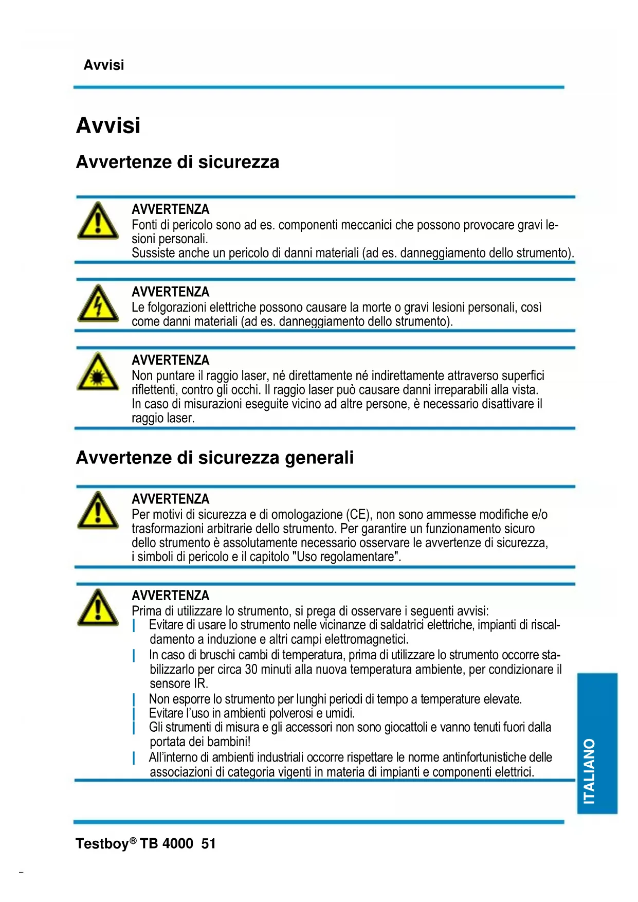 AVVERTENZA Prima di utilizzare lo strumento, si prega di osservare i seguenti avvisi: | Evitare di usare lo strumento nelle vicinanze di saldatrici elettriche, impianti di riscal- damento a induzione e altri campi elettromagnetici. | In caso di bruschi cambi di temperatura, prima di utilizzare lo strumento occorre sta- bilizzarlo per circa 30 minuti alla nuova temperatura ambiente, per condizionare il sensore IR. | Non esporre lo strumento per lunghi periodi di tempo a temperature elevate. | Evitare l’uso in ambienti polverosi e umidi. | Gli strumenti di misura e gli accessori non sono giocattoli e vanno tenuti fuori dalla portata dei bambini! | All’interno di ambienti industriali occorre rispettare le norme antinfortunistiche delle associazioni di categoria vigenti in materia di impianti e componenti elettrici.Avvisi 52 Testboy