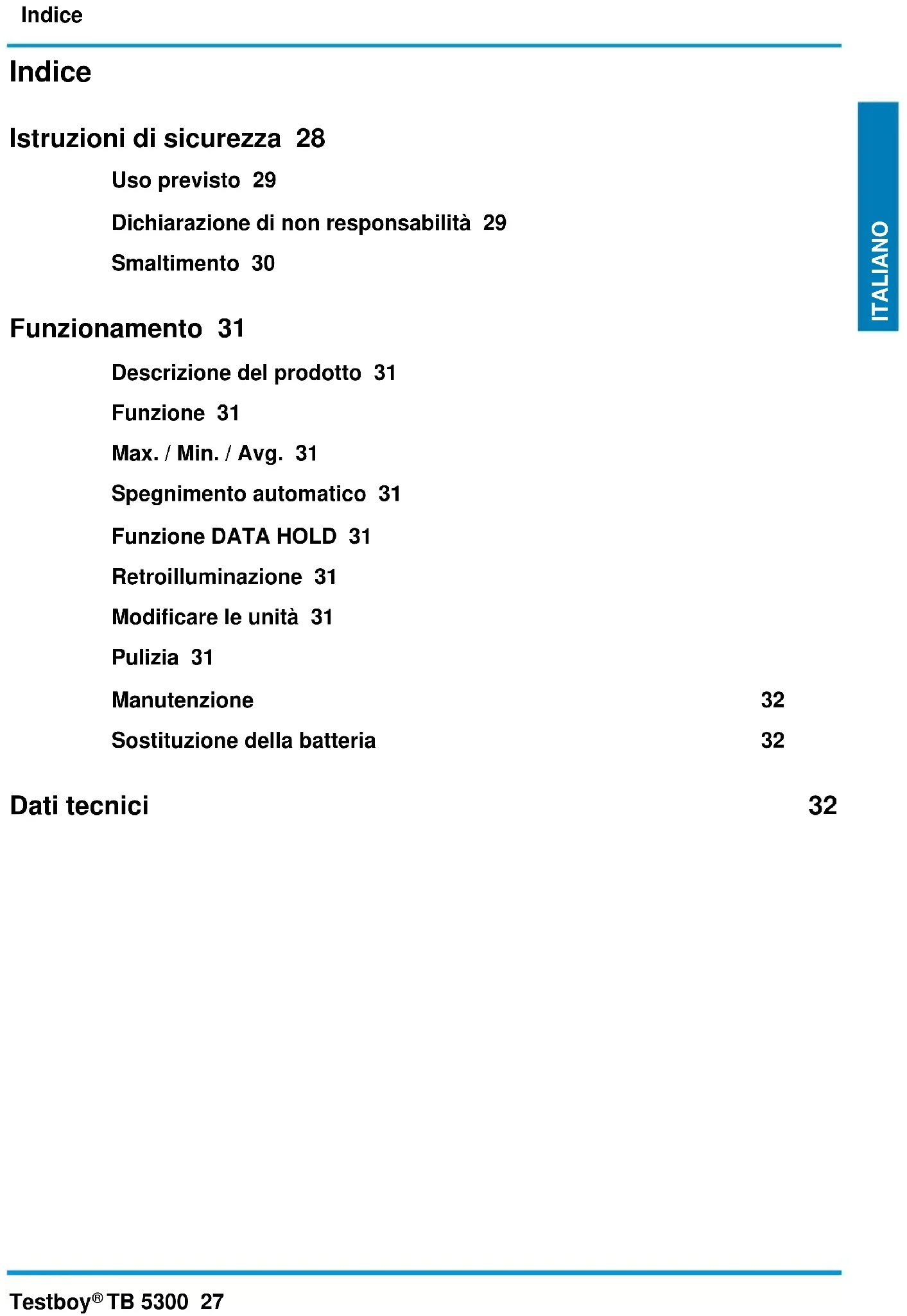 Indice Istruzioni di sicurezza 28 Uso previsto 29 Dichiarazione di non responsabilità 29 Smaltimento 30 Funzionamento 31 Descrizione del prodotto 31 Funzione 31 Max. / Min. / Avg. 31 Spegnimento automatico 31 Funzione DATA HOLD 31 Retroilluminazione 31 Modificare le unità 31 Pulizia 31 Manutenzione 32 Sostituzione della batteria 32 Dati tecnici 32Istruzioni di sicurezza 28 Testboy