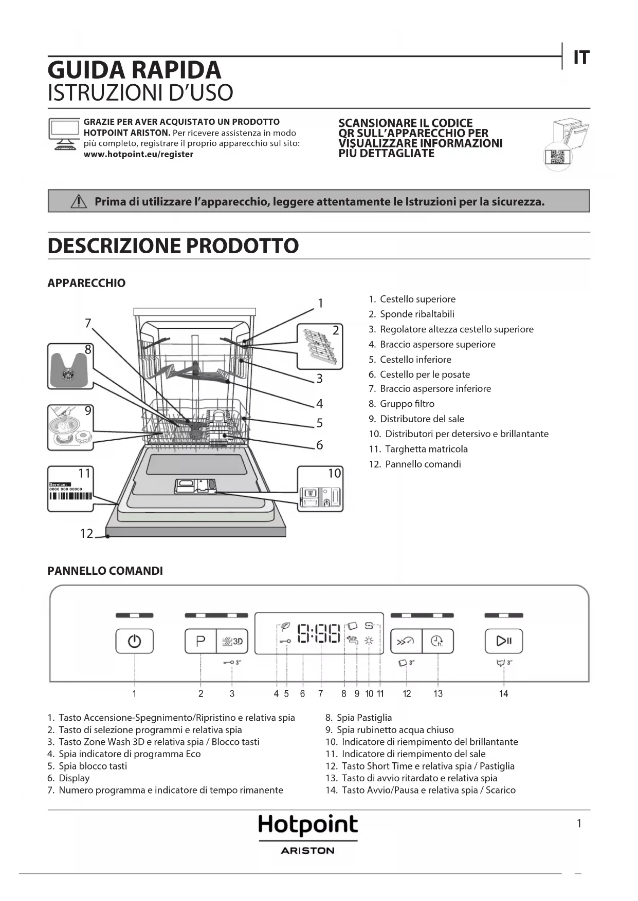GRAZIE PER AVER ACQUISTATO UN PRODOTTOHOTPOINT ARISTON. Per ricevere assistenza in modopiù completo, registrare il proprio apparecchio sul sito:www.hotpoint.eu/register DESCRIZIONE PRODOTTO APPARECCHIOPrima di utilizzare l’apparecchio, leggere attentamente le Istruzioni per la sicurezza.PANNELLO COMANDI1. Cestello superiore2. Sponde ribaltabili3. Regolatore altezza cestello superiore4. Braccio aspersore superiore5. Cestello inferiore6. Cestello per le posate7. Braccio aspersore inferiore8. Gruppo ltro9. Distributore del sale10. Distributori per detersivo e brillantante11. Targhetta matricola12. Pannello comandi1. Tasto Accensione-Spegnimento/Ripristino e relativa spia2. Tasto di selezione programmi e relativa spia3. Tasto Zone Wash 3D e relativa spia / Blocco tasti4. Spia indicatore di programma Eco5. Spia blocco tasti6. Display7. Numero programma e indicatore di tempo rimanente8. Spia Pastiglia9. Spia rubinetto acqua chiuso10. Indicatore di riempimento del brillantante11. Indicatore di riempimento del sale12. Tasto Short Time e relativa spia / Pastiglia13. Tasto di avvio ritardato e relativa spia14. Tasto Avvio/Pausa e relativa spia / Scarico0000 000 00000 Service: