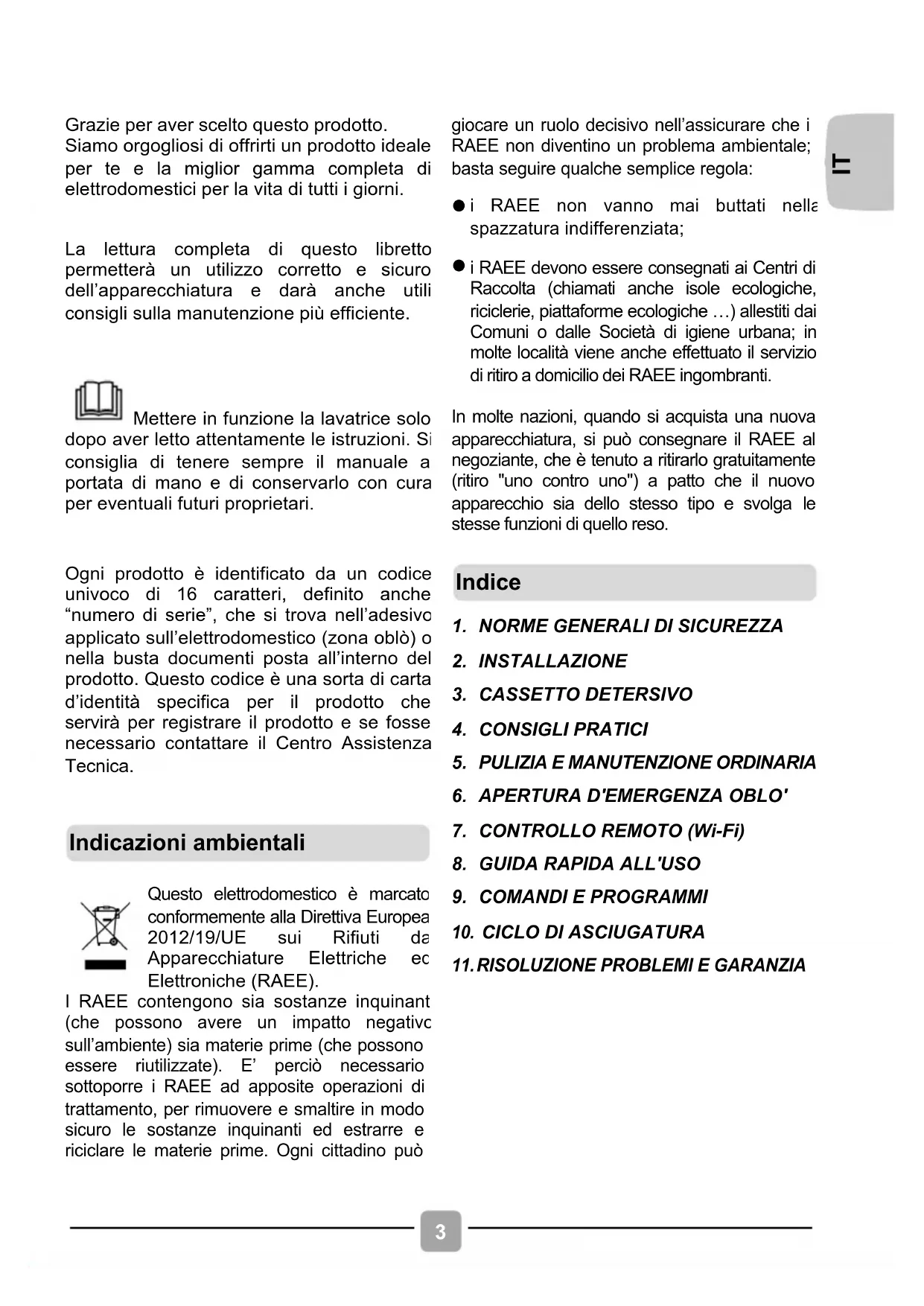 Mettere in funzione la lavatrice solo dopo aver letto attentamente le istruzioni. Si consiglia di tenere sempre il manuale a portata di mano e di conservarlo con cura per eventuali futuri proprietari.
