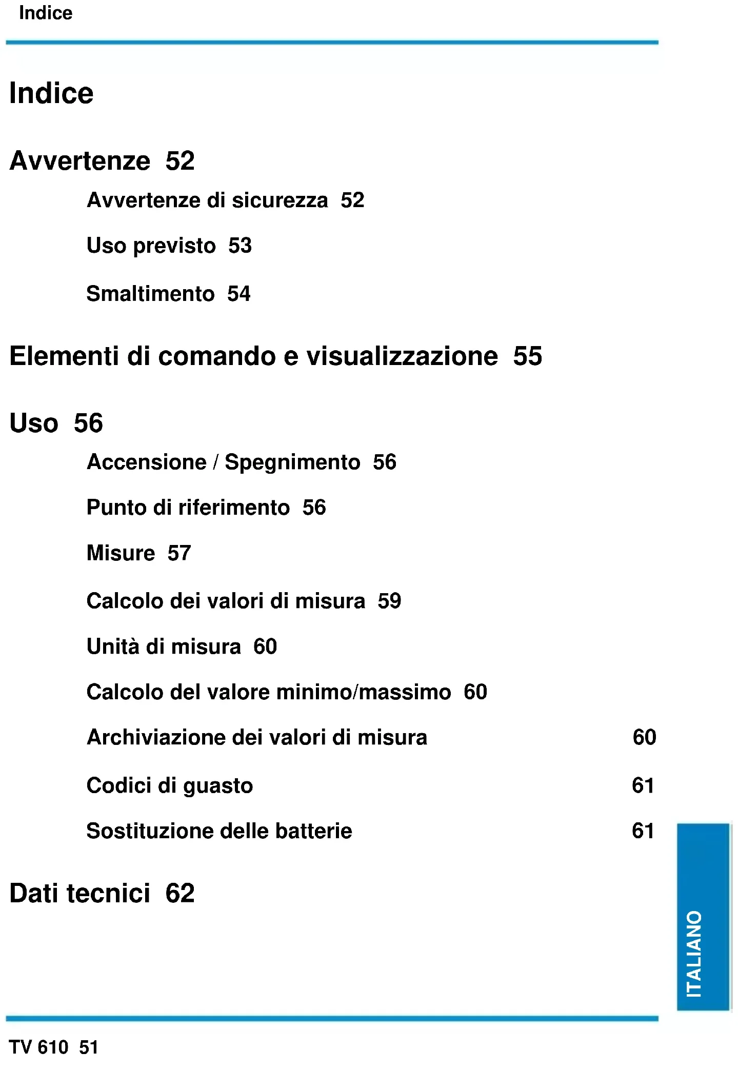 AVVERTENZA Prima di utilizzare lo strumento, si prega di osservare le seguenti avvertenze: | Evitare di usare lo strumento nelle vicinanze di saldatrici elettriche, impianti di ri- scaldamento a induzione e altri campi elettromagnetici. | In caso di bruschi cambi di temperatura, prima di utilizzare lo strumento occorre stabilizzarlo per circa 30 minuti alla nuova temperatura ambiente, per condizio- nare il sensore IR. | Non esporre lo strumento per lunghi periodi di tempo a temperature elevate. | Evitare l'uso in ambienti polverosi e umidi. | Gli strumenti di misura e gli accessori non sono giocattoli e vanno tenuti fuori dalla portata dei bambini! | All'interno di ambienti industriali occorre rispettare le norme antinfortunistiche delle associazioni di categoria vigenti in materia di impianti e componenti elettrici.Avvertenze TV 610 53 ITALIANO ITALIANO ITALIANO
