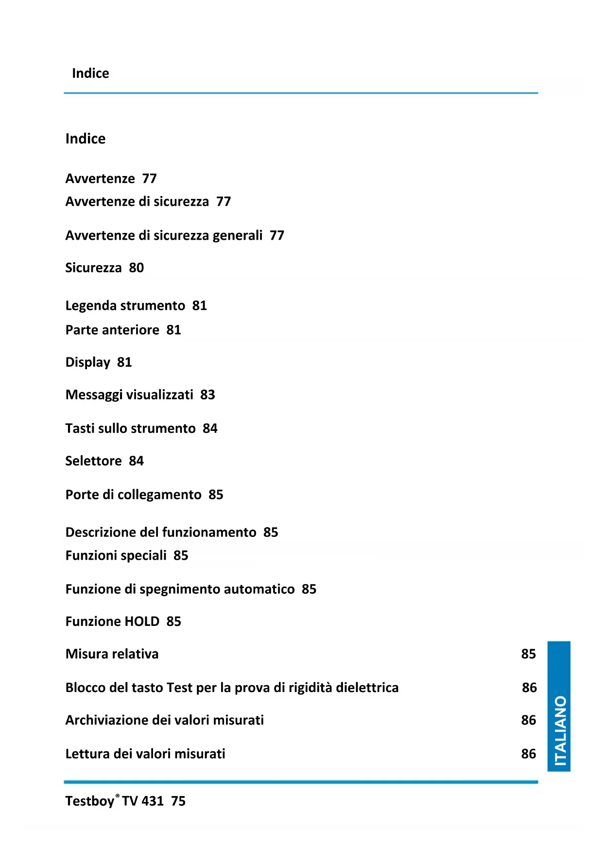 TV 431 75 ITALIANO Indice Avvertenze 77 Avvertenze di sicurezza 77 Avvertenze di sicurezza generali 77 Sicurezza 80 Legenda strumento 81 Parte anteriore 81 Display 81 Messaggi visualizzati 83 Tasti sullo strumento 84 Selettore 84 Porte di collegamento 85 Descrizione del funzionamento 85 Funzioni speciali 85 Funzione di spegnimento automatico 85 Funzione HOLD 85 Misura relativa 85 Blocco del tasto Test per la prova di rigidità dielettrica 86 Archiviazione dei valori misurati 86 Lettura dei valori misurati 86Indice Testboy