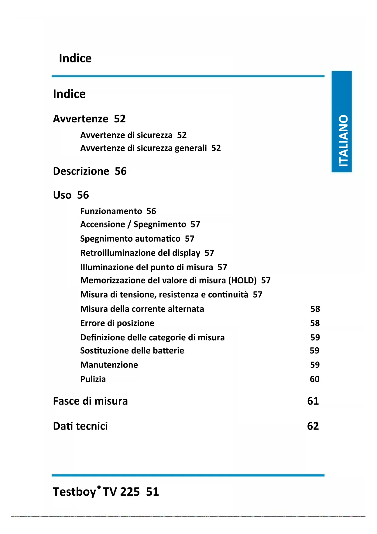 TV 225 51 ENGLISH ITALIANO Indice Avvertenze 52 Avvertenze di sicurezza 52 Avvertenze di sicurezza generali 52 Descrizione 56 Uso 56 Funzionamento 56 Accensione / Spegnimento 57 Spegnimento automatico 57 Retroilluminazione del display 57 Illuminazione del punto di misura 57 Memorizzazione del valore di misura (HOLD) 57 Misura di tensione, resistenza e continuità 57 Misura della corrente alternata 58 Errore di posizione 58 Definizione delle categorie di misura 59 Sostituzione delle batterie 59 Manutenzione 59 Pulizia 60 Fasce di misura 61 Dati tecnici 62Avvertenze 52 Testboy