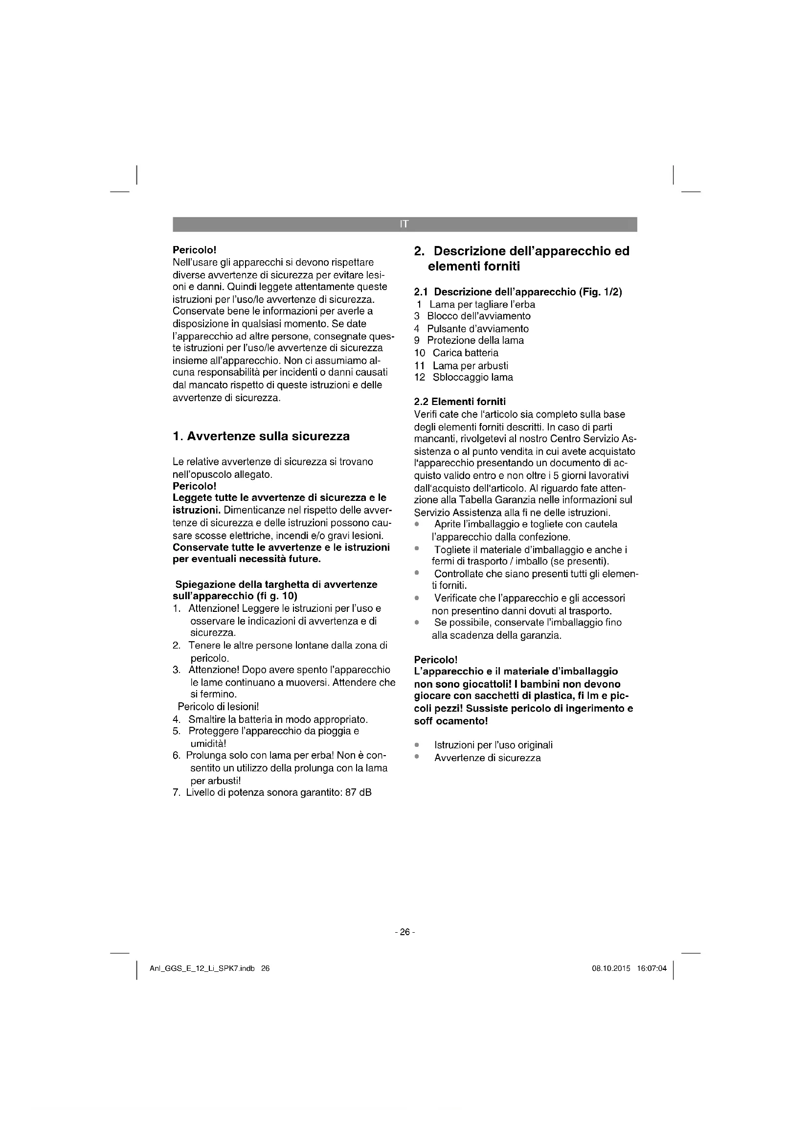 Pericolo! Nell’usare gli apparecchi si devono rispettare diverse avvertenze di sicurezza per evitare lesi- oni e danni. Quindi leggete attentamente queste istruzioni per l’uso/le avvertenze di sicurezza. Conservate bene le informazioni per averle a disposizione in qualsiasi momento. Se date l’apparecchio ad altre persone, consegnate ques- te istruzioni per l’uso/le avvertenze di sicurezza insieme all’apparecchio. Non ci assumiamo al- cuna responsabilità per incidenti o danni causati dal mancato rispetto di queste istruzioni e delle avvertenze di sicurezza.