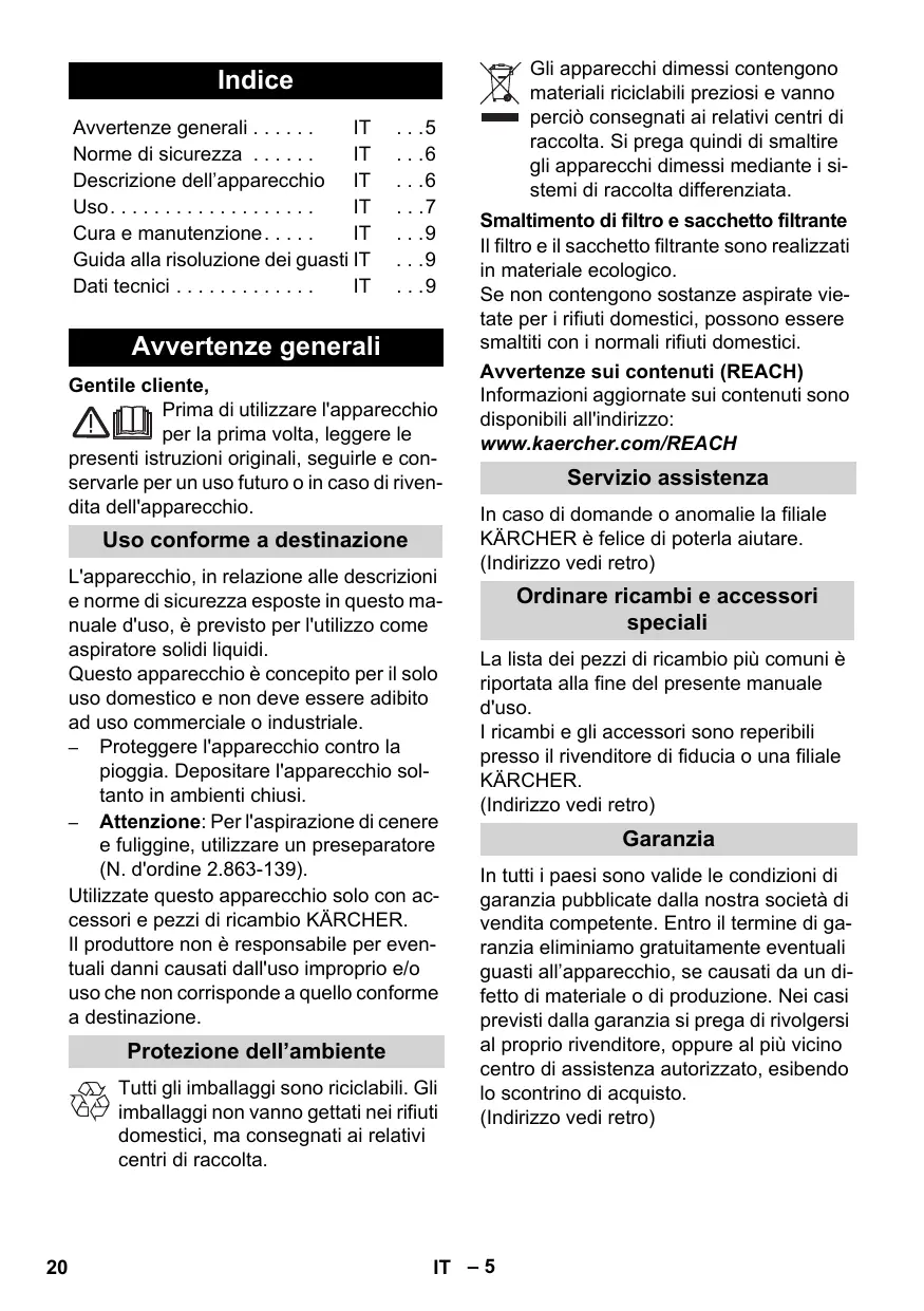 – Protéger l'appareil de la pluie. Ne pas l'entreposer à extérieur. – Attention : en cas d'aspiration de cendre et de suie, utiliser le préséparateur (n° de commande 2.863-139). Seuls des accessoires et des pièces de rechange d’origine autorisés par Kärcher ® doivent être utilisés. Le fabricant décline toute responsabilité en cas de dommages dus à une utilisation non conforme ou incorrecte de l'appareil.