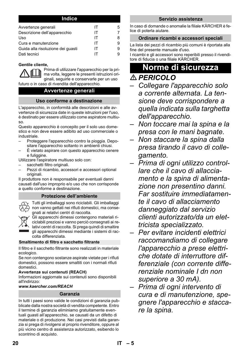 Gentile cliente, Prima di utilizzare l'apparecchio per la prima volta, leggere le presenti istruzioni originali, seguirle e conservarle per un uso futuro o in caso di rivendita dell'apparecchio. Avvertenze generali Uso conforme a destinazione L'apparecchio, in conformità alle descrizioni e alle avvertenze di sicurezza date in queste istruzioni per l'uso, è destinato per essere utilizzato come aspiratore multiuso. Questo apparecchio è concepito per il solo uso domestico e non deve essere adibito ad uso commerciale o industriale. – Proteggere l'apparecchio contro la pioggia. Depositare l'apparecchio soltanto in ambienti chiusi. – È vietato aspirare con questo apparecchio cenere e fuliggine. Utilizzare l'aspiratore multiuso solo con: – sacchetti filtro originali. – Pezzi di ricambio, accessori e accessori optional originali. Il produttore non è responsabile per eventuali danni causati dall'uso improprio e/o uso che non corrisponde a quello conforme a destinazione. Protezione dell’ambiente Tutti gli imballaggi sono riciclabili. Gli imballaggi non vanno gettati nei rifiuti domestici, ma consegnati ai relativi centri di raccolta. Gli apparecchi dimessi contengono materiali riciclabili preziosi e vanno perciò consegnati ai relativi centri di raccolta. Si prega quindi di smaltire gli apparecchi dimessi mediante i sistemi di raccolta differenziata. Smaltimento di filtro e sacchetto filtrante Il filtro e il sacchetto filtrante sono realizzati in materiale ecologico. Se non contengono sostanze aspirate vietate per i rifiuti domestici, possono essere smaltiti con i normali rifiuti domestici. Avvertenze sui contenuti (REACH) Informazioni aggiornate sui contenuti sono disponibili all'indirizzo: www.kaercher.com/REACH Garanzia In tutti i paesi sono valide le condizioni di garanzia pubblicate dalla nostra società di vendita competente. Entro il termine di garanzia eliminiamo gratuitamente eventuali guasti all’apparecchio, se causati da un difetto di materiale o di produzione. Nei casi previsti dalla garanzia si prega di rivolgersi al proprio rivenditore, oppure al più vicino centro di assistenza autorizzato, esibendo lo scontrino di acquisto.
