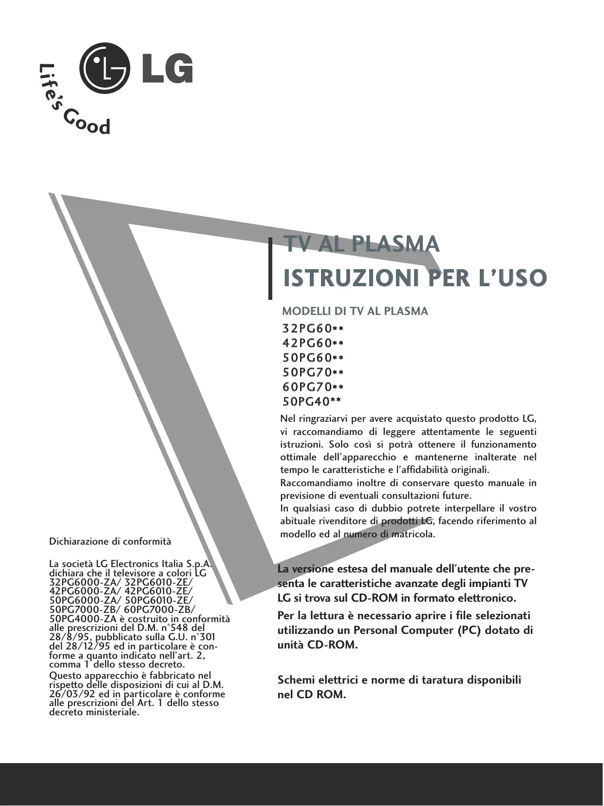 Scarica le istruzioni per il tuo Televisore in formato PDF gratuitamente! Trova il tuo manuale 32PG6000 - LG e riprendi in mano il tuo dispositivo elettronico. In questa pagina sono pubblicati tutti i documenti necessari per l'utilizzo del tuo dispositivo. 32PG6000 del marchio LG.