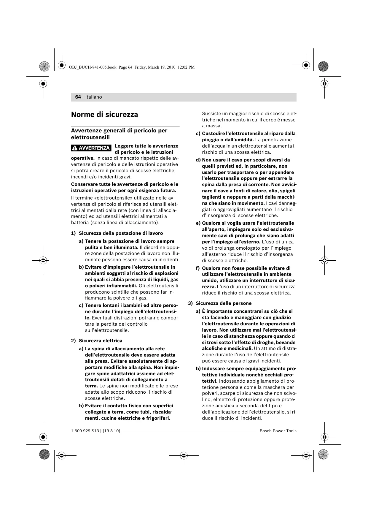 co. Per il proprio lavoro, utilizzare esclu- sivamente l’elettroutensile esplicita- mente previsto per il caso. Con un elettroutensile adatto si lavora in modo migliore e più sicuro nell'ambito della sua potenza di prestazione. le. Italiano | 65 b) Non utilizzare mai elettroutensili con in- terruttori difettosi. Un elettroutensile con l'interruttore rotto & pericoloso e de- ve essere aggiustato. €) Prima di procedere ad operazioni di re- golazione sulla macchina, prima di sosti- tuire parti accessorie oppure prima di posare la macchina al termine di un lavo- ro, estrarre sempre la spina dalla presa della corrente e/o estrarre la batteria ri- caricabile. Tale precauzione eviterà che l'elettroutensile possa essere messo in funzione involontariamente. d) Quando gli elettroutensili non vengono utilizzati, conservarli al di fuori del rag- gio di accesso di bambini. Non fare usare l'elettroutensile a persone che non siano abituate ad usarlo o che non abbiano let- to le presenti istruzioni. Gli elettroutensi- li sono macchine pericolose quando ven- gono utilizzati da persone non dotate di sufficiente esperienza. €) Eseguire la manutenzione dell’'elettrou- tensile operando con la dovuta diligenza. Accertarsi che le parti mobili della mac- china funzionino perfettamente, che non s’inceppino e che non ci siano pezzi rotti © danneggiati al punto da limitare la fun- zione dell'elettroutensile stesso. Prima di iniziare l’impiego, far riparare le parti danneggiate. Numerosi incident vengono causati da elettroutensili la cui manuten- zione è stata effettuata poco accurata- mente. f) Mantenere gli utensili da taglio sempre affilati e puliti. Gi utensili da taglio curati con particolare attenzione e con taglienti affilati s'inceppano meno frequentemente € sono più facili da condurre.