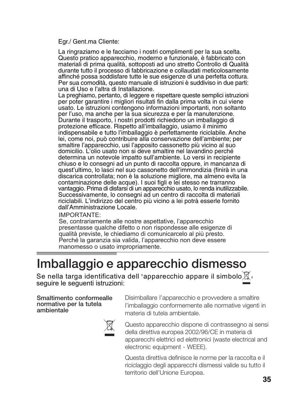 Egr./ Gent.ma Cliente: La ringraziamo e le facciamo i nostri complimenti per la sua scelta. Quesio pratico apparecchio, moderno e funzionale, à fabbricato con materiali di prima qualità, sottoposti ad uno stretto Controllo di Qualità durante tutto il processo di fabbricazione e collaudati meticolosamente affinché possa soddisfare tutte le sue esigenze di una perfetta cottura. Per sua comodità, questo manuale di istruzioni è suddiviso in due parti: una di Uso e l’altra di Installazione. La preghiamo, pertanto, di leggere e rispettare queste semplici istruzioni per poter garantire i migliori risultati fin dalla prima volta in cui viene usato. Le istruzioni contengono informazioni importanti, non soltanto per l’uso, ma anche per la sua sicurezza e per la manutenzione. Durante il trasporto, i nostri prodotti richiedono un imballaggio di protezione efficace. Rispetto all’imballaggio, usiamo il minimo indispensabile e tutto l'imballaggio à perfettamente riciclabile. Anche lei, come noi, pu contribuire alla conservazione dell'ambiente; per smaltire l’apparecchio, usi l’apposito cassonetto più vicino al suo domicilio. L'olio usato non si deve smaltire nel lavandino perché determina un notevole impatto sull’ambiente. Lo versi in recipiente chiuso e lo consegni ad un punto di raccolta oppure, in mancanza di quest'ultimo, lo lasci nel suo cassonetto dell’immondizia (finirà in una discarica controllata; non à la soluzione migliore, ma almeno evita la contaminazione delle acque). | suoi figli e lei stesso ne trarranno vantaggio. Prima di disfarsi di un apparecchio usato, lo renda inutilizzabile. Successivamente, lo consegni ad un centro di raccolta di materiali riciclabili. L'indirizzo del centro più vicino a lei potrà esserle fornito dall'Amministrazione Locale. IMPORTANTE: Se, contrariamente alle nostre aspettative, l'apparecchio presentasse qualche difetto o non rispondesse alle esigenze di qualità previste, le chiediamo di comunicarcelo al più presto. Perché la garanzia sia valida, l’apparecchio non deve essere manomesso o usato impropriamente. Imballaggio e apparecchio dismesso Se nella targa identificativa dell ‘apparecchio appare il simbolo seguire le seguenti istruzioni: _ Smaltimento conformealle Disimballare l'apparecchio e provvedere a smaltire normative per la tutela l'imballaggio conformemente alle normative vigenti in ambientale materia di tutela ambientale. Y Questo apparecchio dispone di contrassegno ai sensi della direttiva europea 2002/96/CE in materia di apparecchi elettrici ed elettronici (waste electrical and electronic equipment - WEÉEE). Questa direttiva definisce le norme per la raccolta e il riciclaggio degli apparecchi dismessi valide su tutto il territorio dell'Unione Europea.
