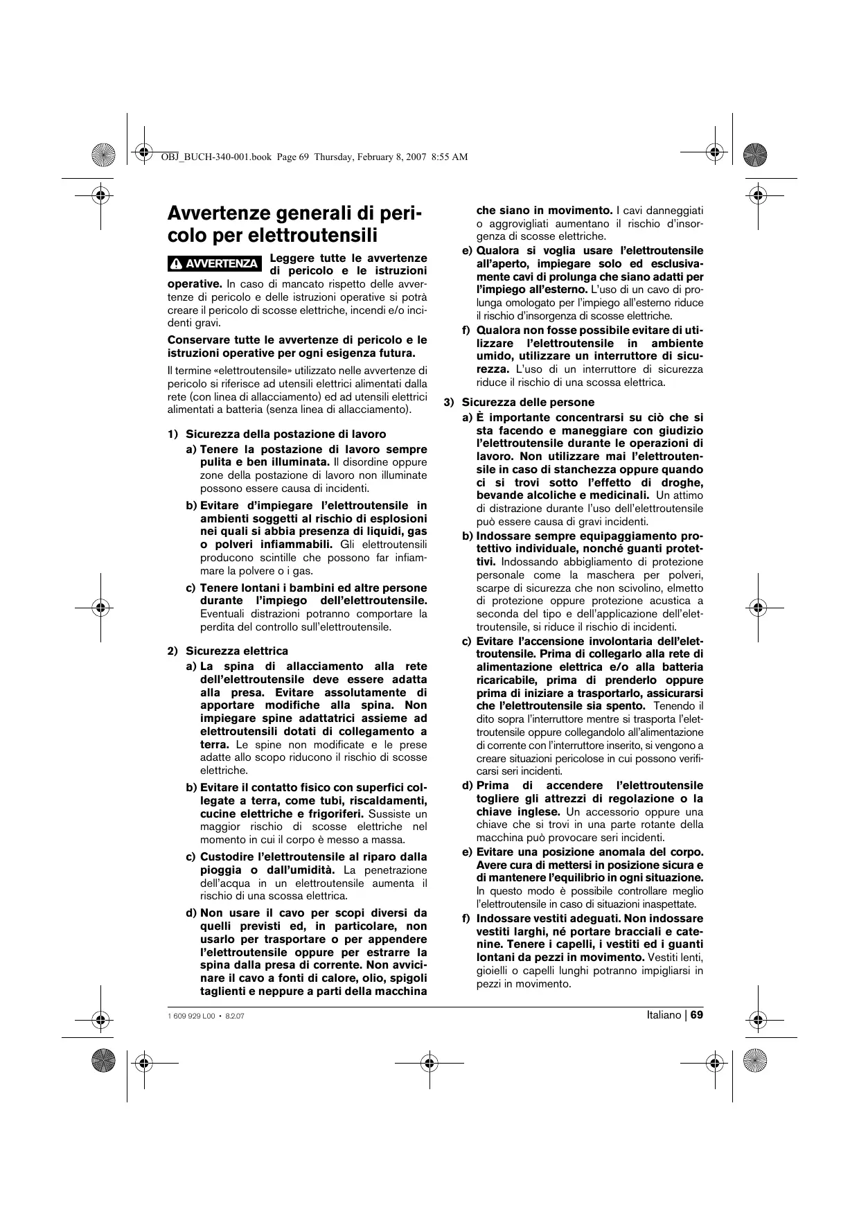 a) È importante concentrarsi su ciò che si sta facendo e maneggiare con giudizio l’elettroutensile durante le operazioni di lavoro. Non utilizzare mai l’elettroutensile in caso di stanchezza oppure quando ci si trovi sotto l’effetto di droghe, bevande alcoliche e medicinali. Un attimo di distrazione durante l’uso dell’elettroutensile può essere causa di gravi incidenti. b) Indossare sempre equipaggiamento protettivo individuale, nonché guanti protettivi. Indossando abbigliamento di protezione personale come la maschera per polveri, scarpe di sicurezza che non scivolino, elmetto di protezione oppure protezione acustica a seconda del tipo e dell’applicazione dell’elettroutensile, si riduce il rischio di incidenti. c) Evitare l’accensione involontaria dell’elettroutensile. Prima di collegarlo alla rete di alimentazione elettrica e/o alla batteria ricaricabile, prima di prenderlo oppure prima di iniziare a trasportarlo, assicurarsi che l’elettroutensile sia spento. Tenendo il dito sopra l’interruttore mentre si trasporta l’elettroutensile oppure collegandolo all’alimentazione di corrente con l’interruttore inserito, si vengono a creare situazioni pericolose in cui possono verificarsi seri incidenti. d) Prima di accendere l’elettroutensile togliere gli attrezzi di regolazione o la chiave inglese. Un accessorio oppure una chiave che si trovi in una parte rotante della macchina può provocare seri incidenti. e) Evitare una posizione anomala del corpo. Avere cura di mettersi in posizione sicura e di mantenere l’equilibrio in ogni situazione. In questo modo è possibile controllare meglio l’elettroutensile in caso di situazioni inaspettate. f) Indossare vestiti adeguati. Non indossare vestiti larghi, né portare bracciali e catenine. Tenere i capelli, i vestiti ed i guanti lontani da pezzi in movimento. Vestiti lenti, gioielli o capelli lunghi potranno impigliarsi in pezzi in movimento. Italiano | 69 OBJ_BUCH-340-001.book Page 70 Thursday, February 8, 2007 8:55 AM g) In caso fosse previsto il montaggio di dispositivi di aspirazione della polvere e di raccolta, assicurarsi che gli stessi siano collegati e che vengano utilizzati correttamente. L’utilizzo di un’aspirazione polvere può ridurre lo svilupparsi di situazioni pericolose dovute alla polvere.