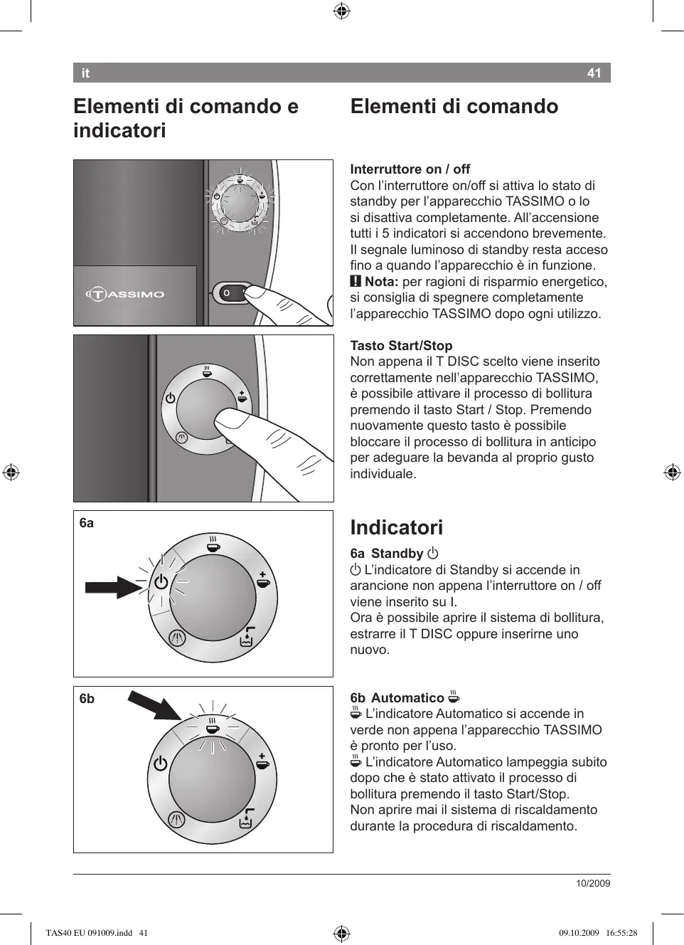 6b Automatico O O L’indicatore Automatico si accende in verde non appena l’apparecchio TASSIMO è pronto per l’uso. . O L’indicatore Automatico lampeggia subito dopo che è stato attivato il processo di bollitura premendo il tasto Start /Stop. Non aprire mai il sistema di riscaldamento durante la procedura di riscaldamento. 10/2009 TAS40 EU 091009.indd 41