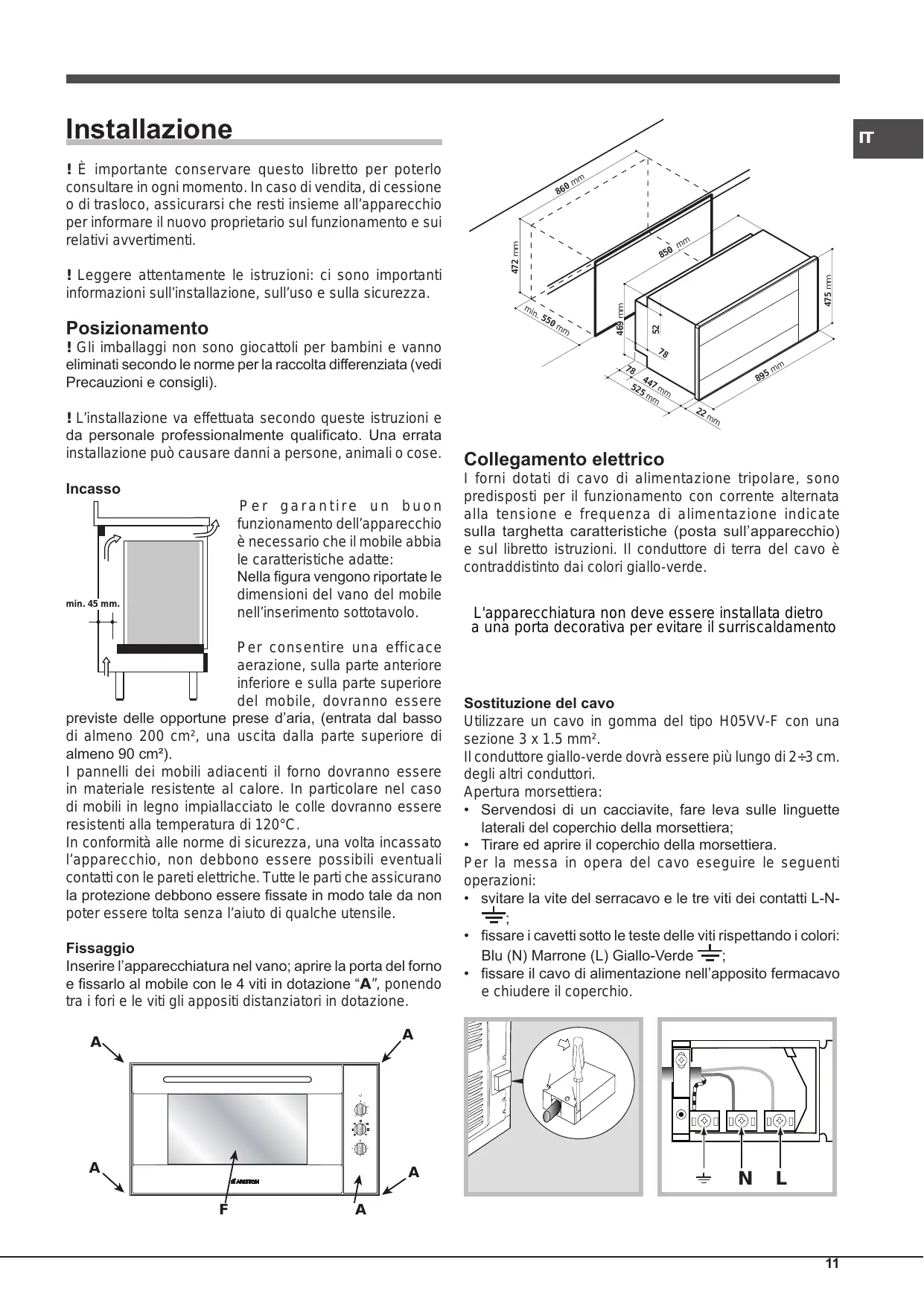 Inserire l'apparecchiatura nel vano; après la porta del forn o e fissarlo al mobile con le 4 viti in dotazione "A", ponendo tra i fori e le viti gli appositi distanziatori in dotazione.