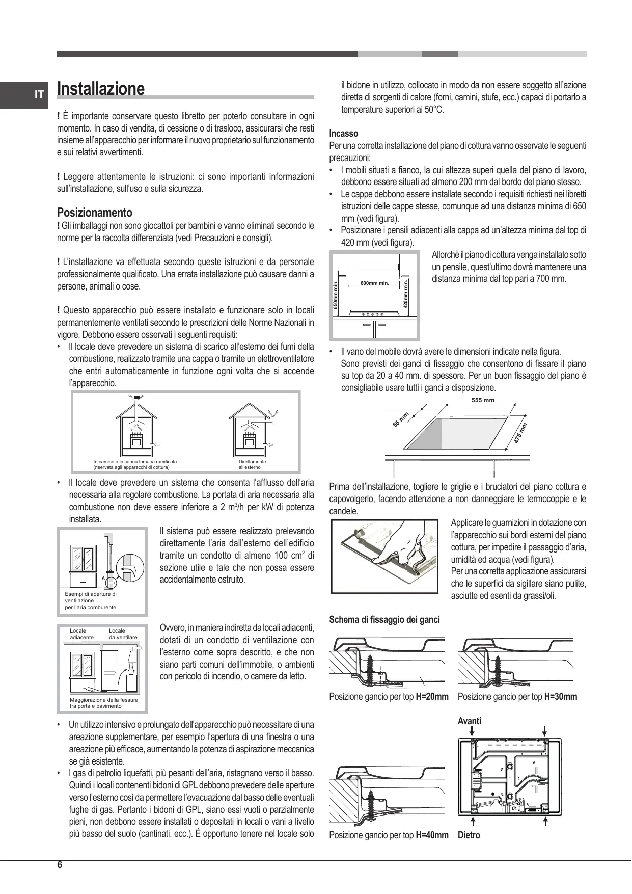• Les gaz de pétrole liquéfiés, plus lourds que l’air, se déposent et stagnent vers le bas. Les locaux qui contiennent donc des bouteilles de G.P.L doivent prévoir des ouvertures vers l’extérieur afin de permettre l’évacuation du gaz par le bas en cas de fuites accidentelles. Les bouteilles de GPL, qu’elles soient vides ou partiellement pleines, ne devront donc pas être installées ou entreposées dans des locaux qui se trouvent au dessous du niveau du sol (caves etc.). Il est opportun de n’entreposer dans le local que la bouteille que vous êtes en train d’utiliser, placée de façon à ne pas être sujette à l’action directe de sources de chaleur (fours, feux de bois, poêles etc.) qui peuvent atteindre des températures dépassant 50°C. Encastrement Pour une installation correcte de la table de cuisson, il faut se conformer aux instructions suivantes : • Les meubles jouxtant la table, dont la hauteur dépasse celle du plan de cuisson, doivent être placés à au moins 200 mm du bord du plan. • Les hottes doivent être installées conformément aux instructions reportées dans leur notice d’installation et à au moins 650 mm de distance (voir figure). • Les éléments hauts jouxtant la hotte doivent être placés à au moins 420 mm de distance du plan de travail (voir figure). En cas d’installation de la table de cuisson sous un élément haut, ce dernier devra être monté à au moins 700 mm de distance du plan. 600mm min. 420mm min.