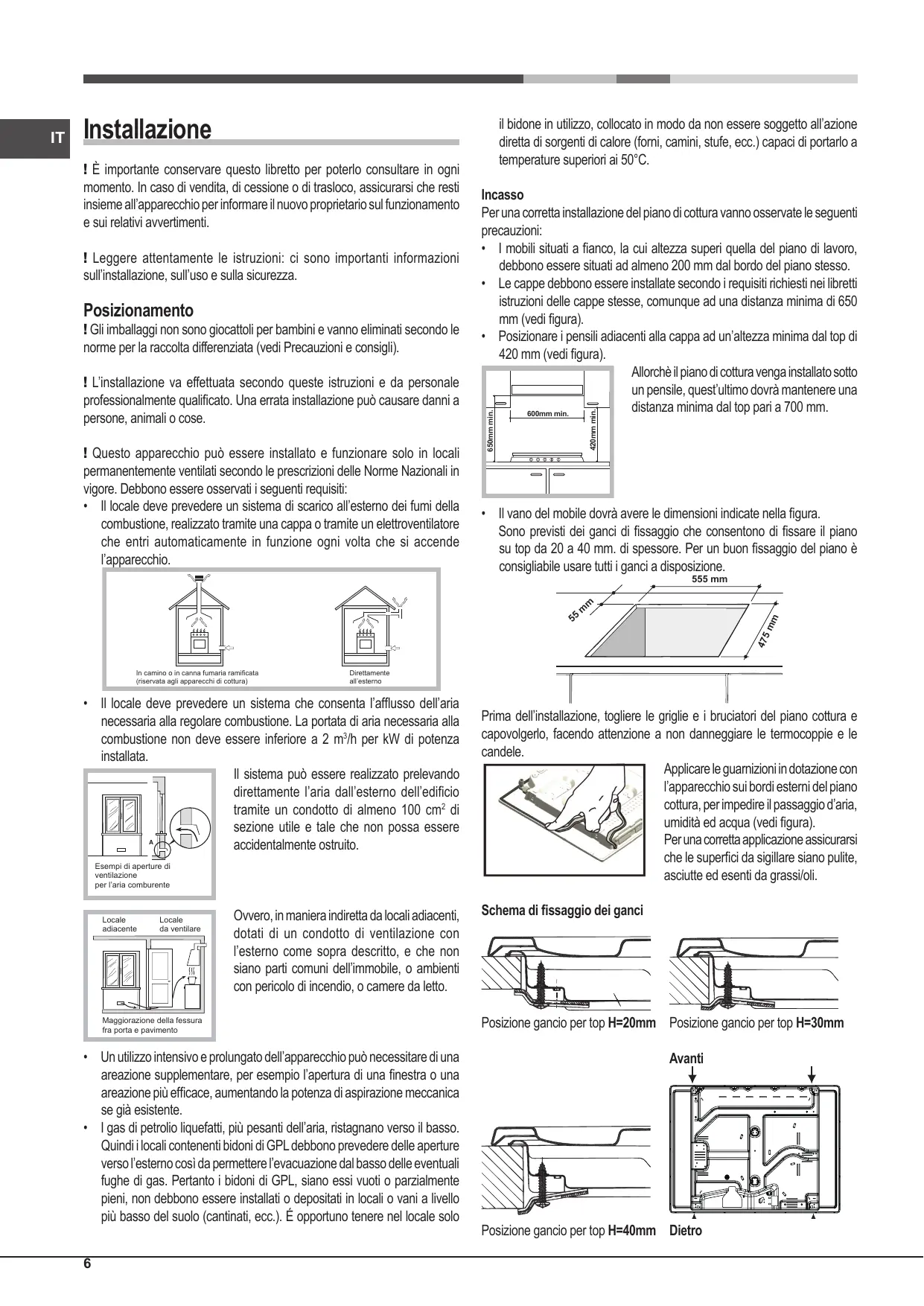 • Les gaz de pétrole liquéfiés, plus lourds que l’air, se déposent et stagnent vers le bas. Les locaux qui contiennent donc des bouteilles de G.P.L doivent prévoir des ouvertures vers l’extérieur afin de permettre l’évacuation du gaz par le bas en cas de fuites accidentelles. Les bouteilles de GPL, qu’elles soient vides ou partiellement pleines, ne devront donc pas être installées ou entreposées dans des locaux qui se trouvent au dessous du niveau du sol (caves etc.). Il est opportun de n’entreposer dans le local que la bouteille que vous êtes en train d’utiliser, placée de façon à ne pas être sujette à l’action directe de sources de chaleur (fours, feux de bois, poêles etc.) qui peuvent atteindre des températures dépassant 50°C. Encastrement Pour une installation correcte de la table de cuisson, il faut se conformer aux instructions suivantes : • Les meubles jouxtant la table, dont la hauteur dépasse celle du plan de cuisson, doivent être placés à au moins 200 mm du bord du plan. • Les hottes doivent être installées conformément aux instructions reportées dans leur notice d’installation et à au moins 650 mm de distance (voir figure). • Les éléments hauts jouxtant la hotte doivent être placés à au moins 420 mm de distance du plan de travail (voir figure). En cas d’installation de la table de cuisson sous un élément haut, ce dernier devra être monté à au moins 700 mm de distance du plan. 600mm min. 420mm min.