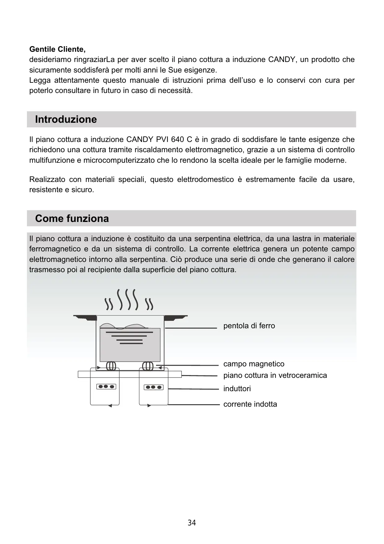 Gentile Cliente, desideriamo ringraziarLa per aver scelto il piano cottura a induzione CANDY, un prodotto che sicuramente soddisferà per molti anni le Sue esigenze. Legga attentamente questo manuale di istruzioni prima dell’uso e lo conservi con cura per poterlo consultare in futuro in caso di necessità. Introduzione Il piano cottura a induzione CANDY PVI 640 C è in grado di soddisfare le tante esigenze che richiedono una cottura tramite riscaldamento elettromagnetico, grazie a un sistema di controllo multifunzione e microcomputerizzato che lo rendono la scelta ideale per le famiglie moderne. Realizzato con materiali speciali, questo elettrodomestico è estremamente facile da usare, resistente e sicuro. Come funziona Il piano cottura a induzione è costituito da una serpentina elettrica, da una lastra in materiale ferromagnetico e da un sistema di controllo. La corrente elettrica genera un potente campo elettromagnetico intorno alla serpentina. Ciò produce una serie di onde che generano il calore trasmesso poi al recipiente dalla superficie del piano cottura. pentola di ferro campo magnetico piano cottura in vetroceramica induttori corrente indotta