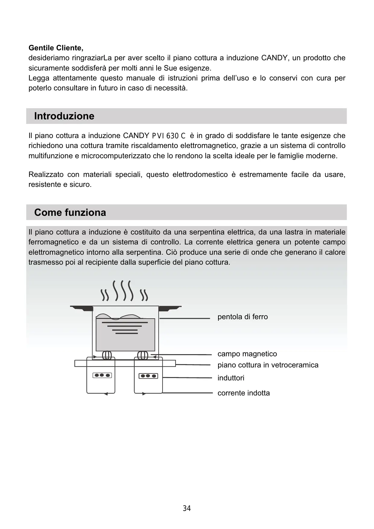 Gentile Cliente, desideriamo ringraziarLa per aver scelto il piano cottura a induzione CANDY, un prodotto che sicuramente soddisferà per molti anni le Sue esigenze. Legga attentamente questo manuale di istruzioni prima dell’uso e lo conservi con cura per poterlo consultare in futuro in caso di necessità. Introduzione Il piano cottura a induzione CANDY PVI 630 C è in grado di soddisfare le tante esigenze che richiedono una cottura tramite riscaldamento elettromagnetico, grazie a un sistema di controllo multifunzione e microcomputerizzato che lo rendono la scelta ideale per le famiglie moderne. Realizzato con materiali speciali, questo elettrodomestico è estremamente facile da usare, resistente e sicuro. Come funziona Il piano cottura a induzione è costituito da una serpentina elettrica, da una lastra in materiale ferromagnetico e da un sistema di controllo. La corrente elettrica genera un potente campo elettromagnetico intorno alla serpentina. Ciò produce una serie di onde che generano il calore trasmesso poi al recipiente dalla superficie del piano cottura. pentola di ferro campo magnetico piano cottura in vetroceramica induttori corrente indotta