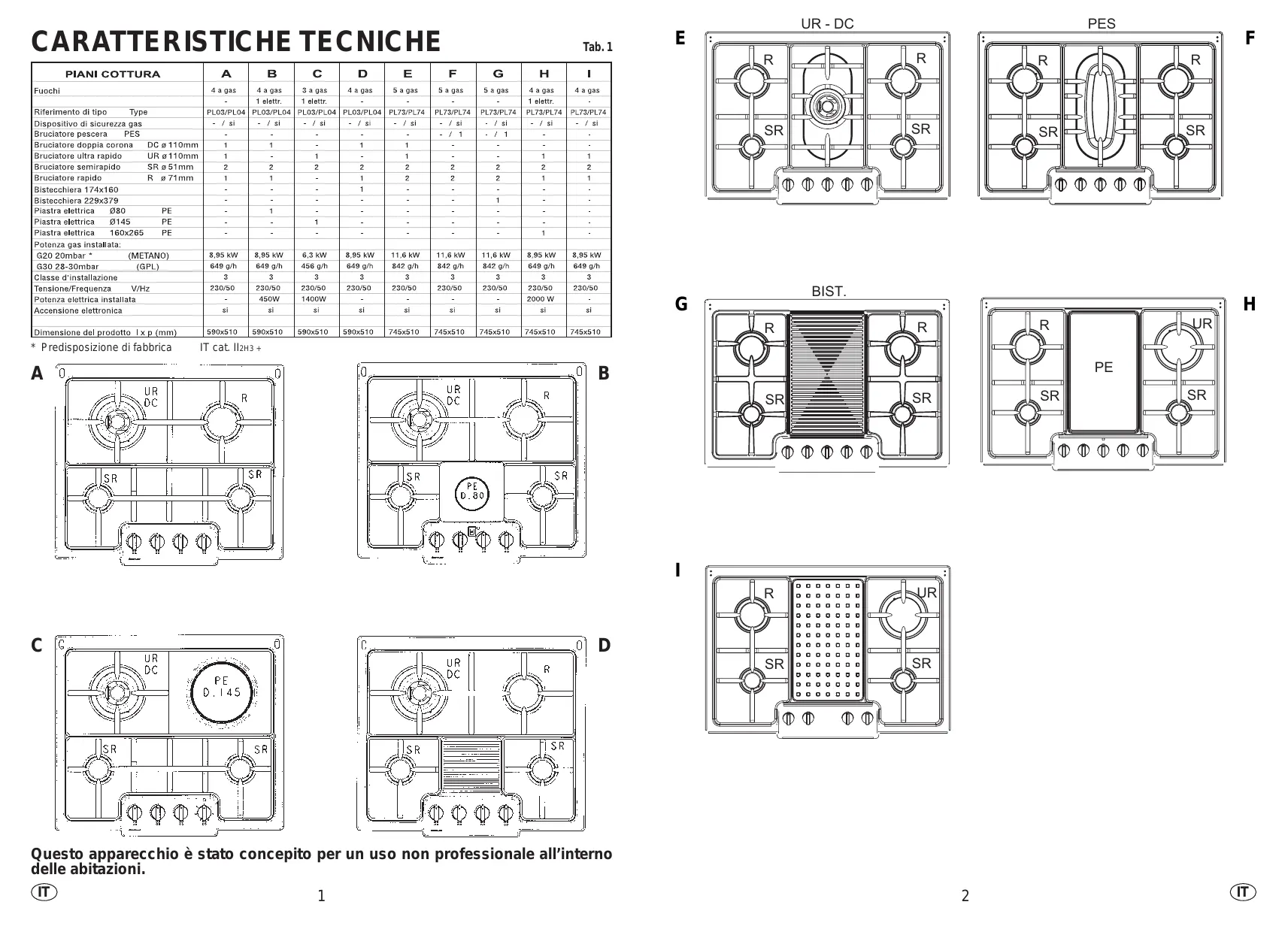 Per accendere i bruciatori del piano di cottura, avvicinare una fiamma al bruciatore, quindi premere e girare in senso antiorario la manopola corrispondente, fino alla posizione di massimo. Se i bruciatori non vengono usati per diversi giorni attendere qualche secondo prima dell’accensione per dare modo all’aria esistente nelle tubazioni di uscire. Per apparecchi dotati di accensione elettronica agire come segue: — premere e ruotare la manopola in senso antiorario fino alla piccola stella ★ — azionare l’accensione premendo l’apposito tasto. Per i piani cottura dotati di accensione automatica è sufficiente premere e ruotare la manopola fino alla piccola stella ★ Il generatore produrrà una serie di scariche fintanto che è mantenuta la pressione sulla manopola. Se la fiamma non si accende entro 5 secondi riportare la manopola in posizione 0 e ripetere l’operazione. Per i modelli dotati di rubinetto con sicurezza (che interrompono il flusso del gas in caso di spegnimento accidentale della fiamma) i bruciatori vengono accesi come sopra descritto, facendo attenzione a mantenere premuta a fondo la manopola per circa 5-6 secondi dopo l’accensione della fiamma. Trascorso tale tempo, necessario al dispositivo di sicurezza per inserirsi, la fiamma risulterà permanente. ATTENZIONE: prima di accendere i bruciatori accertarsi che essi siano ben alloggiati nelle loro sedi e non interferiscano con le candele di accensione. Per una migliore utilizzazione dei bruciatori, si raccomanda di usare pentole a fondo piatto di diametro adatto al bruciatore prescelto. Consultare le figure a pagina 1 e 2. Piano cottura tipo A;B;C;D;E;F;G;H;I. A;B;C;D;E;F;G;H;I. A;B;C;D;E;F;G; H;I. A;B;C;D; E;F;G;H;I.