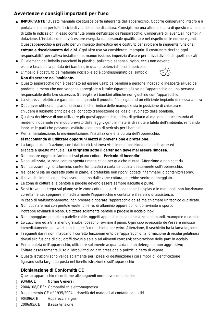 If you cannot identify the cause of the operating anomaly: switch off the appliance (do not subject it to rought treatment) and contact the Assistance Service. PRODUCT SERIAL NUMBER. Where can I find it? It is important you to inform the Assistance Service of your product code and its serial number (a 16 character code which begins with the number 3); this can be found on the guarantee certificate or on the data plate located on the appliance. This will help to avoid wasted journerys to technicians, thereby (and most significantly) saving the corresponding callout charges. Avvertenze e consigli importanti per l’uso IMPORTANTE! Questo manuale costituisce parte integrante dell’apparecchio. Occorre conservarlo integro e a portata di mano per tutto il ciclo di vita del piano di cottura. Consigliamo una attenta lettura di questo manuale e di tutte le indicazioni in esso contenute prima dell’utilizzo dell’apparecchio. Conservare gli eventuali ricambi in dotazione. L’installazione dovrà essere eseguita da personale qualificato e nel rispetto delle norme vigenti. Quest’apparecchio è previsto per un impiego domestico ed è costruito per svolgere la seguente funzione: cottura e riscaldamento dei cibi. Ogni altro uso va considerato improprio. Il costruttore declina ogni responsabilità per cattiva installazione, manomissione, imperizia d’uso e per utilizzi diversi da quelli indicati Gli elementi dell’imballo (sacchetti in plastica, polistirolo espanso, nylon, ecc.) non devono essere lasciati alla portata dei bambini, in quanto potenziali fonti di pericolo. L’imballo è costituito da materiale riciclabile ed è contrassegnato dal simbolo: Non disperdere nell’ambiente. Questo apparecchio non è destinato ad essere usato da bambini e persone incapaci o inesperte all’uso del prodotto, a meno che non vengano sorvegliate o istruite riguardo all’uso dell’apparecchio da una persona responsabile della loro sicurezza. Sorvegliare i bambini affinchè non giochino con l'apparecchio. La sicurezza elettrica è garantita solo quando il prodotto è collegato ad un efficiente impianto di messa a terra Dopo aver utilizzato il piano, assicurarsi che l’indice delle manopole sia in posizione di chiusura e chiudere il rubinetto principale del condotto d’erogazione del gas o il rubinetto della bombola. Qualora decidesse di non utilizzare più quest’apparecchio, prima di gettarlo al macero, si raccomanda di renderlo inoperante nel modo previsto dalle leggi vigenti in materia di salute e tutela dell’ambiente, rendendo innocue le parti che possono costituire elemento di pericolo per i bambini. Per la manutenzione, la movimentazione, l'installazione e la pulizia dell'apparecchio, si raccomanda di utilizzare opportuni mezzi di prevenzione e protezione. La targa di identificazione, con i dati tecnici, si trova visibilmente posizionata sotto il carter ed allegata a questo manuale. La targhetta sotto il carter non deve mai essere rimossa. Non posare oggetti infiammabili sul piano cottura. Pericolo di incendio! Dopo utilizzata, la zona cottura spenta rimane calda per qualche minuto. Attenzione a non cottarla. Non utilizzare fogli di alluminio, contenitori plastici o carta da cucina direttamente sull'apparecchio. Nel caso vi sia un cassetto sotto al piano, è preferibile non riporvi oggetti infiammabili o contenitori spray. Il cavo di alimentazione dev'essere lontano dalle zone cottura, potrebbe venire danneggiato. Le zone di cottura e le pentole e padelle devono essere sempre asciutte e pulite. Se si trova una crepa sul piano; se le zone cottura si surriscaldano; se il display o le manopole non funzionano correttamente, spegnere immediatamente l'apparecchio e contattare il servizio di assistenza. In caso di malfunzionamento, non provare a riparare l'apparecchio da sé ma chiamare un tecnico qualificato. Non cucinare mai con pentole vuote, di ferro, di alluminio oppure col fondo rovinato o sporco. Potrebbe rovinarsi il piano. Utilizzare solamente pentole o padelle in acciaio inox. Non appoggiare pentole o padelle calde, oggetti appuntiti o pesanti nella zona comandi, manopole o cornice. Lo zucchero ed altri alimenti granulosi possono rovinare il piano. Ogni cibo rovesciato dev'essere rimosso immediatamente, dai vetri, con lo specifico raschietto per vetro. Attenzione, il raschietto ha la lama tagliente. I seguenti danni non intaccano il corretto funzionamento dell'apparecchio: la formazione di residui gelatinosi dovuti alla fusione di cibi; graffi dovuti a sale o ad alimenti corrosivi; scolorazione delle parti in acciaio. Per la pulizia dell'apparecchio, utilizzare solamente acqua calda ed un detergente non aggressivo; Evitare assolutamente l'uso di idropulitrici ad alta pressione o pulitrici a getto di vapore Queste istruzioni sono valide solamente per i paesi di destinazione i cui simboli di identificazione figurano sulla targhetta posta nel libretto istruzioni e sull’apparecchio Dichiarazione di Conformità CE Questo apparecchio è conforme alle seguenti normative comunitarie: