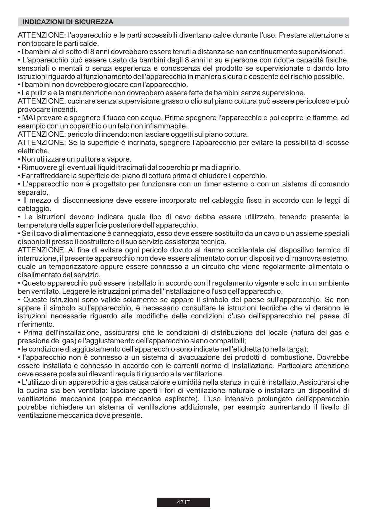 - L'utilizzo di un apparecchio a gas causa calore e umidità nella stanza in cui è installato. Assicurarsi che la cucina sia ben ventilata: lasciare aperti i fori di ventilazione naturale o installare un dispositivi di ventilazione meccanica (cappa meccanica aspirante). L'uso intensivo prolungato dell'apparecchio potrebbe richiedere un sistema di ventilazione addizionale, per esempio aumentando il livello di ventilazione meccanica dove presente. 42 IT