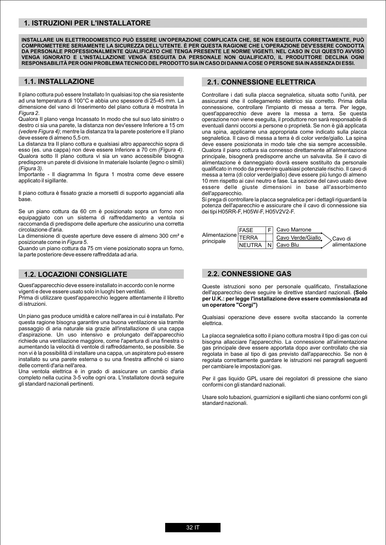 INSTALLARE UN ELETTRODOMESTICO PUÒ ESSERE UN'OPERAZIONE COMPLICATA CHE, SE NON ESEGUITA CORRETTAMENTE, PUÒ COMPROMETTERE SERIAMENTE LA SICUREZZA DELL'UTENTE. È PER QUESTA RAGIONE CHE L'OPERAZIONE DEV'ESSERE CONDOTTA DA PERSONALE PROFESSIONALMENTE QUALIFICATO CHE TENGA PRESENTE LE NORME VIGENTI. NEL CASO IN CUI QUESTO AVVISO VENGA IGNORATO E L'INSTALLAZIONE VENGA ESEGUITA DA PERSONALE NON QUALIFICATO, IL PRODUTTORE DECLINA OGNI RESPONSABILITÀ PER OGNI PROBLEMA TECNICO DEL PRODOTTO SIA IN CASO DI DANNI A COSE O PERSONE SIA IN ASSENZA DI ESSI. 1.1. INSTALLAZIONE 2.1. CONNESSIONE ELETTRICA Il plano cottura può essere Installato In qualsiasi top che sia resistente ad una temperatura di 100°C e abbia uno spessore di 25-45 mm. La dimensione del vano di Inserimento del plano cottura è mostrata In Figura 2. Qualora II plano venga Incassato In modo che sul suo lato sinistro o destro ci sia una parete, la distanza non dev'essere Inferiore a 15 cm (vedere Figura 4); mentre la distanza tra la parete posteriore e II plano deve essere di almeno 5,5 cm. La distanza tra II plano cottura e qualsiasi altro apparecchio sopra di esso (es. una cappa) non deve essere Inferiore a 70 cm (Figura 4). Qualora sotto II plano cottura vi sia un vano accessibile bisogna predisporre un parete di divisione In materiale Isolante (legno o slmili) (Figura 3). Importante - Il diagramma In figura 1 mostra come deve essere applicato il sigillante. Controllare i dati sulla placca segnaletica, situata sotto l'unità, per assicurarsi che il collegamento elettrico sia corretto. Prima della connessione, controllare l'impianto di messa a terra. Per legge, quest'apparecchio deve avere la messa a terra. Se questa operazione non viene eseguita, il produttore non sarà responsabile di eventuali danni occorsi a persone o proprietà. Se non è già applicata una spina, applicarne una appropriata come indicato sulla placca segnaletica. Il cavo di messa a terra è di color verde/giallo. La spina deve essere posizionata in modo tale che sia sempre accessibile. Qualora il piano cottura sia connesso direttamente all'alimentazione principale, bisognerà predisporre anche un salvavita. Se il cavo di alimentazione è danneggiato dovrà essere sostituito da personale qualificato in modo da prevenire qualsiasi potenziale rischio. Il cavo di messa a terra (di color verde/giallo) deve essere più lungo di almeno 10 mm rispetto ai cavi neutro e fase. La sezione del cavo usato deve essere delle giuste dimensioni in base all'assorbimento dell'apparecchio. Si prega di controllare la placca segnaletica per i dettagli riguardanti la potenza dell'aparecchio e assicurare che il cavo di connessione sia dei tipi H05RR-F, H05W-F, H05V2V2-F. Il piano cottura è fissato grazie a morsetti di supporto agganciati alla base. Se un piano cottura da 60 cm è posizionato sopra un forno non equipaggiato con un sistema di raffreddamento a ventola si raccomanda di predisporre delle aperture che assicurino una corretta circolazione d'aria. La dimensione di queste aperture deve essere di almeno 300 cm² e posizionate come in Figura 5. Quando un piano cottura da 75 cm viene posizionato sopra un forno, la parte posteriore deve essere raffreddata ad aria. FASE Alimentazione TERRA principale NEUTRA F Cavo Marrone Cavo Verde/Giallo N Cavo Blu Cavo di alimentazione 2.2. CONNESSIONE GAS 1.2. LOCAZIONI CONSIGLIATE Quest'apparecchio deve essere installato in accordo con le norme vigenti e deve essere usato solo in luoghi ben ventilati. Prima di utilizzare quest'apparecchio leggere attentamente il libretto di istruzioni. Queste istruzioni sono per personale qualificato, l'installazione dell'apparecchio deve seguire le direttive standard nazionali. (Solo per U.K.: per legge l'installazione deve essere commissionata ad un operatore "Corgi") Un piano gas produce umidità e calore nell'area in cui è installato. Per questa ragione bisogna garantire una buona ventilazione sia tramite passaggio di aria naturale sia grazie all'installazione di una cappa d'aspirazione. Un uso intensivo e prolungato dell'apparecchio richiede una ventilazione maggiore, come l'apertura di una finestra o aumentando la velocità di ventole di raffreddamento, se possibile. Se non vi è la possibilità di installare una cappa, un aspiratore può essere installato su una parete esterna o su una finestra affinché ci siano delle correnti d'aria nell'area. Una ventola elettrica è in grado di assicurare un cambio d'aria completo nella cucina 3-5 volte ogni ora. L'installatore dovrà seguire gli standard nazionali pertinenti. Qualsiasi operazione deve essere svolta staccando la corrente elettrica. La placca segnaletica sotto il piano cottura mostra il tipo di gas con cui bisogna allacciare l'apparecchio. La connessione all'alimentazione gas principale deve essere apportata dopo aver controllato che sia regolata in base al tipo di gas previsto dall'apparecchio. Se non è regolata correttamente guardare le istruzioni nei paragrafi seguenti per cambiare le impostazioni gas. Per il gas liquido GPL usare dei regolatori di pressione che siano conformi con gli standard nazionali. Usare solo tubazioni, guarnizioni e sigillanti che siano conformi con gli standard nazionali. 32 IT Per alcuni modelli viene fornito in dotazione una raccordo conico, come attrezzatura per l'installazione, nei paesi dove è obbligatorio per legge; in Figura 8 viene mostrato come riconoscere i diversi tipi di raccordi (CY=cilindrico, CO=conico). In qualsiasi caso la parte cilindrica del raccordo sarà connessa al piano cottura.