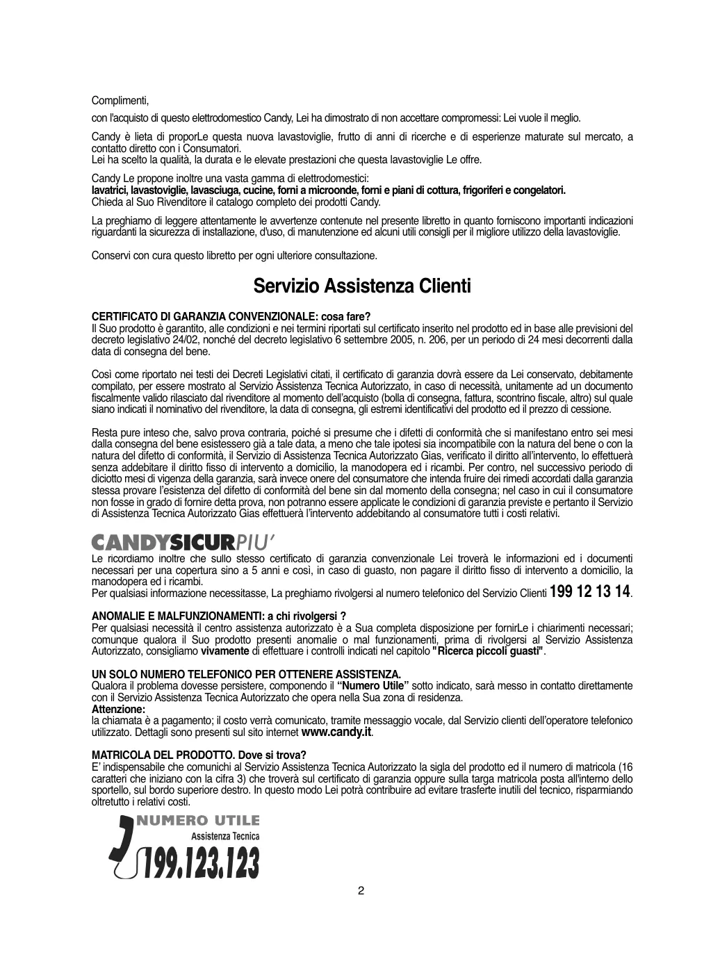 Complimenti, con l'acquisto di questo elettrodomestico Candy, Lei ha dimostrato di non accettare compromessi: Lei vuole il meglio. Candy è lieta di proporLe questa nuova lavastoviglie, frutto di anni di ricerche e di esperienze maturate sul mercato, a contatto diretto con i Consumatori. Lei ha scelto la qualità, la durata e le elevate prestazioni che questa lavastoviglie Le offre. Candy Le propone inoltre una vasta gamma di elettrodomestici: lavatrici, lavastoviglie, lavasciuga, cucine, forni a microonde, forni e piani di cottura, frigoriferi e congelatori. Chieda al Suo Rivenditore il catalogo completo dei prodotti Candy. La preghiamo di leggere attentamente le avvertenze contenute nel presente libretto in quanto forniscono importanti indicazioni riguardanti la sicurezza di installazione, d'uso, di manutenzione ed alcuni utili consigli per il migliore utilizzo della lavastoviglie. Conservi con cura questo libretto per ogni ulteriore consultazione. Servizio Assistenza Clienti CERTIFICATO DI GARANZIA CONVENZIONALE: cosa fare? Il Suo prodotto è garantito, alle condizioni e nei termini riportati sul certificato inserito nel prodotto ed in base alle previsioni del decreto legislativo 24/02, nonché del decreto legislativo 6 settembre 2005, n. 206, per un periodo di 24 mesi decorrenti dalla data di consegna del bene. Così come riportato nei testi dei Decreti Legislativi citati, il certificato di garanzia dovrà essere da Lei conservato, debitamente compilato, per essere mostrato al Servizio Assistenza Tecnica Autorizzato, in caso di necessità, unitamente ad un documento fiscalmente valido rilasciato dal rivenditore al momento dell’acquisto (bolla di consegna, fattura, scontrino fiscale, altro) sul quale siano indicati il nominativo del rivenditore, la data di consegna, gli estremi identificativi del prodotto ed il prezzo di cessione. Resta pure inteso che, salvo prova contraria, poiché si presume che i difetti di conformità che si manifestano entro sei mesi dalla consegna del bene esistessero già a tale data, a meno che tale ipotesi sia incompatibile con la natura del bene o con la natura del difetto di conformità, il Servizio di Assistenza Tecnica Autorizzato Gias, verificato il diritto all’intervento, lo effettuerà senza addebitare il diritto fisso di intervento a domicilio, la manodopera ed i ricambi. Per contro, nel successivo periodo di diciotto mesi di vigenza della garanzia, sarà invece onere del consumatore che intenda fruire dei rimedi accordati dalla garanzia stessa provare l’esistenza del difetto di conformità del bene sin dal momento della consegna; nel caso in cui il consumatore non fosse in grado di fornire detta prova, non potranno essere applicate le condizioni di garanzia previste e pertanto il Servizio di Assistenza Tecnica Autorizzato Gias effettuerà l’intervento addebitando al consumatore tutti i costi relativi. Le ricordiamo inoltre che sullo stesso certificato di garanzia convenzionale Lei troverà le informazioni ed i documenti necessari per una copertura sino a 5 anni e così, in caso di guasto, non pagare il diritto fisso di intervento a domicilio, la manodopera ed i ricambi. Per qualsiasi informazione necessitasse, La preghiamo rivolgersi al numero telefonico del Servizio Clienti 199 12 13 14. ANOMALIE E MALFUNZIONAMENTI: a chi rivolgersi ? Per qualsiasi necessità il centro assistenza autorizzato è a Sua completa disposizione per fornirLe i chiarimenti necessari; comunque qualora il Suo prodotto presenti anomalie o mal funzionamenti, prima di rivolgersi al Servizio Assistenza Autorizzato, consigliamo vivamente di effettuare i controlli indicati nel capitolo "Ricerca piccoli guasti". UN SOLO NUMERO TELEFONICO PER OTTENERE ASSISTENZA. Qualora il problema dovesse persistere, componendo il “Numero Utile” sotto indicato, sarà messo in contatto direttamente con il Servizio Assistenza Tecnica Autorizzato che opera nella Sua zona di residenza. Attenzione: la chiamata è a pagamento; il costo verrà comunicato, tramite messaggio vocale, dal Servizio clienti dell’operatore telefonico utilizzato. Dettagli sono presenti sul sito internet www.candy.it. MATRICOLA DEL PRODOTTO. Dove si trova? E’ indispensabile che comunichi al Servizio Assistenza Tecnica Autorizzato la sigla del prodotto ed il numero di matricola (16 caratteri che iniziano con la cifra 3) che troverà sul certificato di garanzia oppure sulla targa matricola posta all'interno dello sportello, sul bordo superiore destro. In questo modo Lei potrà contribuire ad evitare trasferte inutili del tecnico, risparmiando oltretutto i relativi costi.