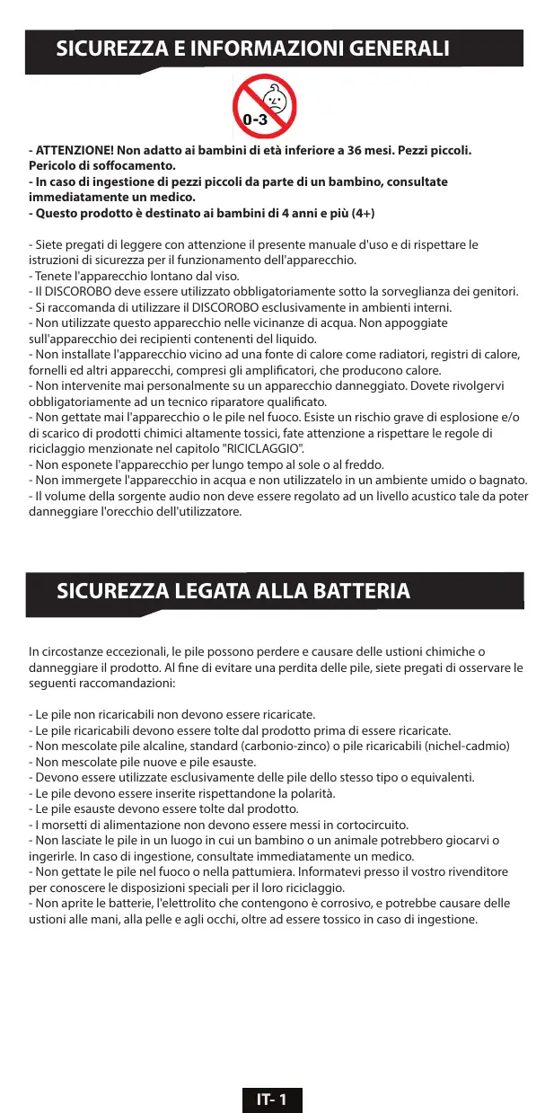 - Siete pregati di sostituire le batterie del DISCOROBO quando notate uno di questi segnali se il viso lampeggia senza interruzione, se i movimenti del robot sono più lenti, oppure se imovimenti non rispettano il ritmo della musica.