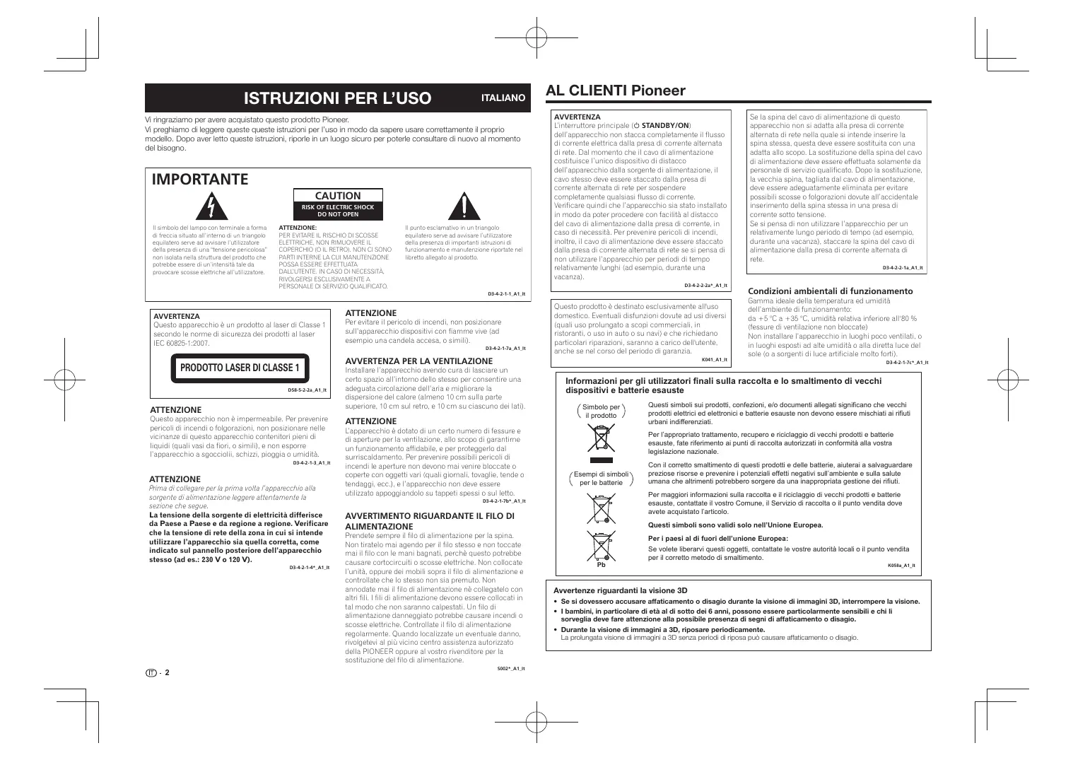 AL CLIENTI Pioneer AVVERTENZA L’interruttore principale ( STANDBY/ON) dell’apparecchio non stacca completamente il flusso di corrente elettrica dalla presa di corrente alternata di rete. Dal momento che il cavo di alimentazione costituisce l’unico dispositivo di distacco dell’apparecchio dalla sorgente di alimentazione, il cavo stesso deve essere staccato dalla presa di corrente alternata di rete per sospendere completamente qualsiasi flusso di corrente. Verificare quindi che l’apparecchio sia stato installato in modo da poter procedere con facilità al distacco del cavo di alimentazione dalla presa di corrente, in caso di necessità. Per prevenire pericoli di incendi, inoltre, il cavo di alimentazione deve essere staccato dalla presa di corrente alternata di rete se si pensa di non utilizzare l’apparecchio per periodi di tempo relativamente lunghi (ad esempio, durante una vacanza). D3-4-2-2-2a*_A1_It