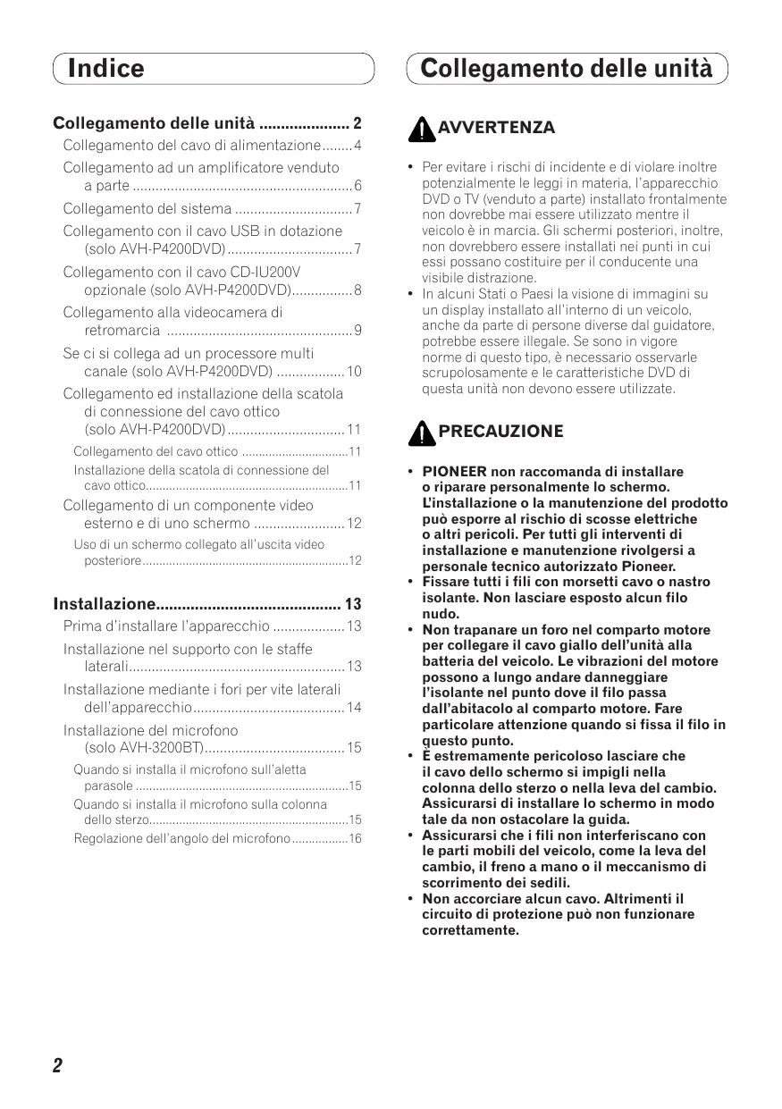 (Indice ) Collegamento delle unità . " Collegamento del cavo di alimentazione. 4 Collegamento ad un amplificatore venduto a parte 6 Collegamento del sistema 7 Collegamento con il cavo USB in dotazione solo AVH-P4200DVD) 7 Collegamento con il cavo CD-IU200V opzionale (solo AVH-P4200DVD) 8 Collegamento alla videocamera di retromarcia 9 Se ci si collega ad un processore multi canale (solo AVH-P4200DVD) 10 Collegamento ed installazione della scatola di connessione del cavo ottico (solo AVH-P4200DVD) 11 Collegamento del cavo ottico 1 Installazione della scatola di connessione del cavo ottico. 1 Collegamento di un componente video esterno e di uno schermo 12 Uso di un schermo collegato all'uscita video posteriore. 12 Installazion: Prima d'installare l'apparecchio 13 Installazione nel supporto con le staffe laterali 13 Installazione mediante i fori per vite lateral dell'apparecchio 14 Installazione del microfono (solo AVH-3200BT) 15 Quando si installa il microfono sull'aletta parasole 15 Quando si installa il microfono sulla colonna dello sterzo 15 Regolazione dell'angolo del microfono 1ô (Collegamento delle unità ) A AVVERTENZA Per evitare i rischi di incidente e di violare inoltre potenzialmente le leggi in materia, l'apparecchio DVD o TV (venduto a parte) installato frontalmente non dovrebbe mai essere utilizzato mentre il veicolo à in marcia. Gli schermi posteriori, inoltre, non dovrebbero essere installati nei punti in cui essi possano costituire per il conducente una visibile distrazione. In alcuni Stati o Paesi la visione di immagini su un display installato all'interno di un veicolo, anche da parte di persone diverse dal guidatore potrebbe essere illegale. Se sono in vigore norme di questo tipo, à necessario osservarle scrupolosamente e le caratteristiche DVD di questa unità non devono essere utilizzate. À PRECAUZIONE PIONEER non raccomanda di installare o riparare personalmente lo schermo. L'installazione o la manutenzione del prodotto pu esporre al rischio di scosse elettriche 1 A personale tecnico autorizzato Pioneer. Fissare tutti i fili con morsetti cavo o nastro isolante. Non lasciare esposto alcun filo nudo. Non trapanare un foro nel comparto motore per collegare iallo dell’unità alla batteria del veicolo. Le vibrazioni del motore possono a lungo andare danneggiare l'isolante nel punto dove il filo passa dall'abitacolo al comparto motore. Fare particolare attenzione quando si fissa il filo in questo punto. Ë estremamente pericoloso lasciare che il cavo dello schermo si impigli nella colonna dello sterzo o nella leva del cambio. Assicurarsi di installare lo schermo in modo tale da non ostacolare la guida. Assicurarsi che i fili non interferiscano con le parti mobili del veicolo, come la leva del cambio, il freno a mano o il meccanismo di scorrimento dei sedil Non accorciare alcun cavo. Altrimenti il circuito di protezione pu non funzionare correttamente.