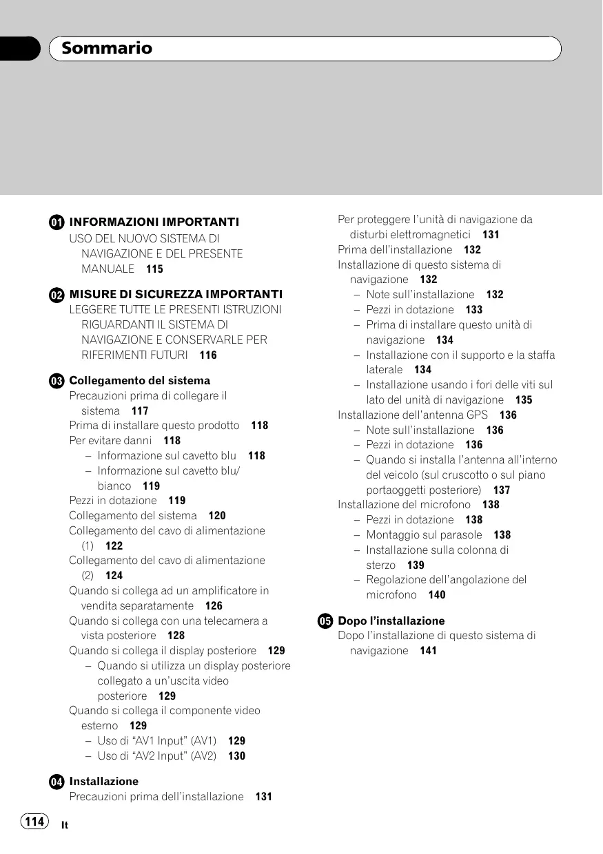 RIFERIMENTI FUTURI 116 @ Collegamento del sistema Precauzioni prima di collegare il sistema 117 Prima di installare questo prodotto 118 Per evitare danni 118 — Informazione sul cavetto blu 118 — Informazione sul cavetto blu/ bianco_ 119 Pezzi in dotazione 119 Collegamento del sistema 120 Collegamento del cavo di alimentazione «) 12 Collegamento del cavo di alimentazione @) 124 Quando si collega ad un amplificatore in vendita separatamente 126 Quando si collega con una telecamera a vista posteriore 128 Quando si collega il display posteriore 129 — Quando si utilizza un display posteriore collegato a un'uscita video posteriore 129 Quando si collega il componente video esterno_ 129 — Uso di ‘AVI Input” (AVI) 129 — Uso di ‘AV2 Input” (AV2) 130 @ installazione Precauzioni prima dell'installazione 131 Per proteggere l’unità di navigazione da disturbi elettromagnetici 131 Prima dell'installazione 132 Installäzione di questo sistema di navigazione 182 — Note sull'installazione 132 — Pezziin dotazione 133 — Prima di installare questo unità di navigazione 134 — Installazione con il supporto & la staffa laterale 134 — Installazione usando i fori delle viti sul lato del unità di navigazione 135 Installäzione del'antenna GPS 136 — Note sull'installazione 136 — Pezziin dotazione 136 — Quando si installa l'antenna all'interno del veicolo (sul cruscotto o sul piano portaoggetti posteriore) 137 Installäzione del microfono 138 — Pezziin dotazione 138 — Montaggio sul parasole 138 — Installazione sulla colonna di sterzo 139 — Regolazione dell'angolazione del microfono 140 @ Dopo l'installazione Dopo l'installazione di questo sistema di navigazione 141