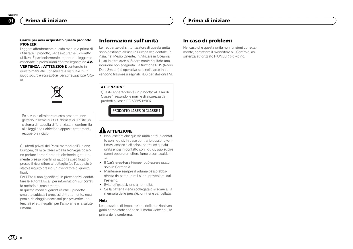 Grazie per aver acquistato questo prodotto PIONEER Leggere attentamente questo manuale prima di utilizzare il prodotto, per assicurarne il corretto utilizzo. È particolarmente importante leggere e osservare le precauzioni contrassegnate da AVVERTENZA e ATTENZIONE contenute in questo manuale. Conservare il manuale in un luogo sicuro e accessibile, per consultazione futura. Prima di iniziare Informazioni sull’unità In caso di problemi Le frequenze del sintonizzatore di questa unità sono destinate all’uso in Europa occidentale, in Asia, nel Medio Oriente, in Africa e in Oceania. L’uso in altre aree può dare come risultato una ricezione non adeguata. La funzione RDS (Radio Data System) è operativa solo nelle aree in cui vengono trasmessi segnali RDS per stazioni FM. Nel caso che questa unità non funzioni correttamente, contattare il rivenditore o il Centro di assistenza autorizzato PIONEER più vicino. ATTENZIONE Questo apparecchio è un prodotto al laser di Classe 1 secondo le norme di sicurezza dei prodotti al laser IEC 60825-1:2007.