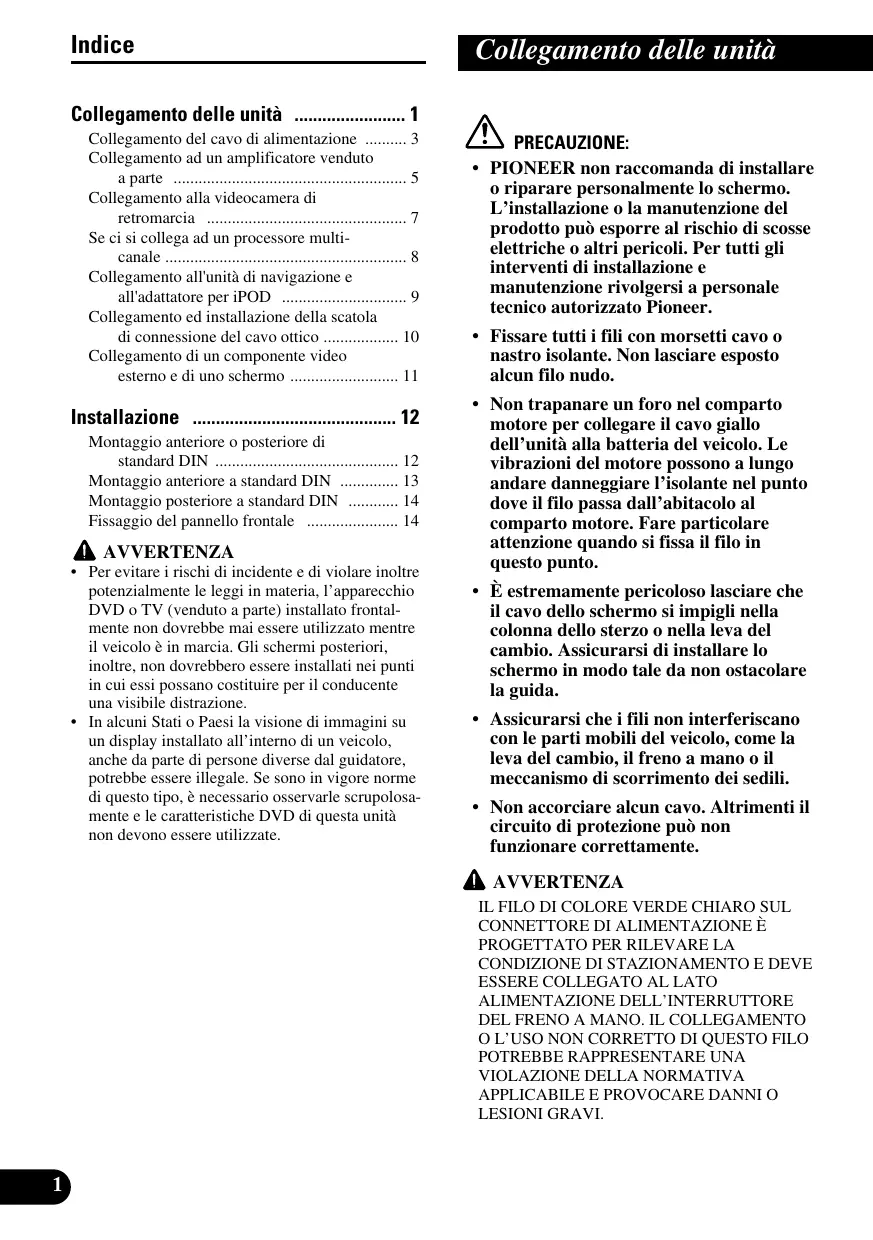 Indice Collegamento delle unità Collegamento del cavo di alimentazione Collegamento ad un amplificatore venduto apare . Collegamento alla videocamera di retromarcia Se ci si coll canale . Collegamento all'unità di navigazione e all'adattatore per iPOD Collegamento ed installazione della scatola di connessione del cavo ottico Collegamento di un componente video esterno e di uno schermo . à ad un process Installazione . Montaggio anteriore o posteriore di standard DIN Montaggio anteriore a standard DIN Montaggio posteriore a standard DIN Fissaggio del pannello frontale À AVVERTENZA + Per evitare i rischi di incidente e di violare inoltre potenzialmente le leggi in materia, l’apparecchio DVD o TV (venduto a parte) installato frontal- mente non dovrebbe mai essere utilizzato mentre il veicolo à in marcia. Gli schermi posteriori, inoltre, non dovrebbero essere installati nei punti in cui essi possano costituire per il conducente una visibile distrazione. In alcuni Stati o Paesi la visione di immagini su un display installato all'interno di un veicolo, anche da parte di persone diverse dal guidatore, potrebbe essere illegale. Se sono in vigore norme di questo tipo, à necessario osservarle mente e le caratterist non devono essere utilizzate. llegamento delle unità VAN PRECAUZIONE: + PIONEER non raccomanda di installare o riparare personalmente lo schermo. L'installazione o la manutenzione del prodotto pud esporre al rischio di scosse elettriche o altri pericoli. Per tutti gli interventi di installazione e manutenzione rivolgersi a personale tecnico autorizzato Pioneer. Fissare tutti i fili con morsetti cavo 0 nastro isolante. Non lasciare esposto alcun filo nudo. Non trapanare un foro nel comparto motore per collegare il cavo giallo dell’unità alla batteria del veicolo. Le vibrazioni del motore possono a lungo andare danneggiare l’isolante nel punto dove il filo passa dall’abitacolo al comparto motore. Fare particolare attenzione quando si fissa il filo in questo punto. È estremamente pericoloso lasciare che il cavo dello schermo si impigli nella colonna dello sterzo o nella leva del cambio. Assicurarsi di installare lo schermo in modo tale da non ostacolare la guida. Assicurarsi che i fili non interferiscano con le parti mobili del veicolo, come la leva del cambio, il freno a mano o il meccanismo di scorrimento dei sedili. Non accorciare alcun cavo. Altrimenti il circuito di protezione pud non funzionare correttamente. À AVVERTENZA IL FILO DI COLORE VERDE CHIARO SUL