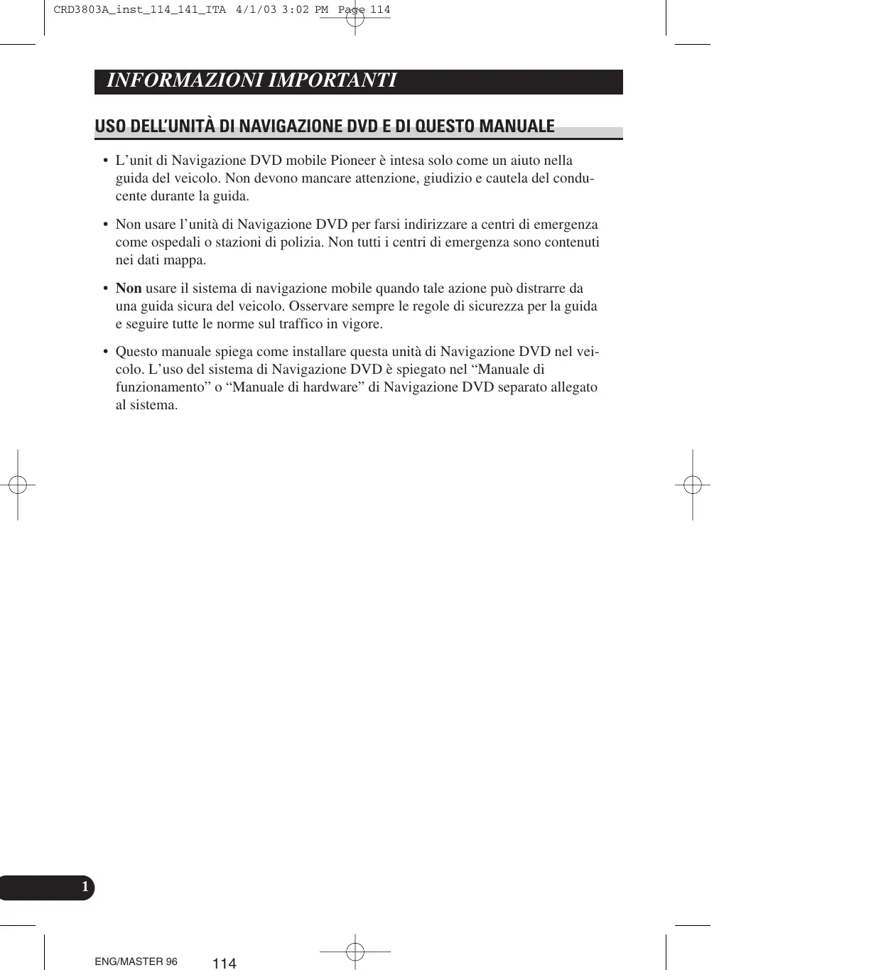 ENG/MASTER 96 CRD3803A_inst_114_141_ITA 4/1/03 3:02 PM Page 114 INFORMAZIONI IMPORTANTI USO DELL’UNITÀ DI NAVIGAZIONE DVD E DI QUESTO MANUALE