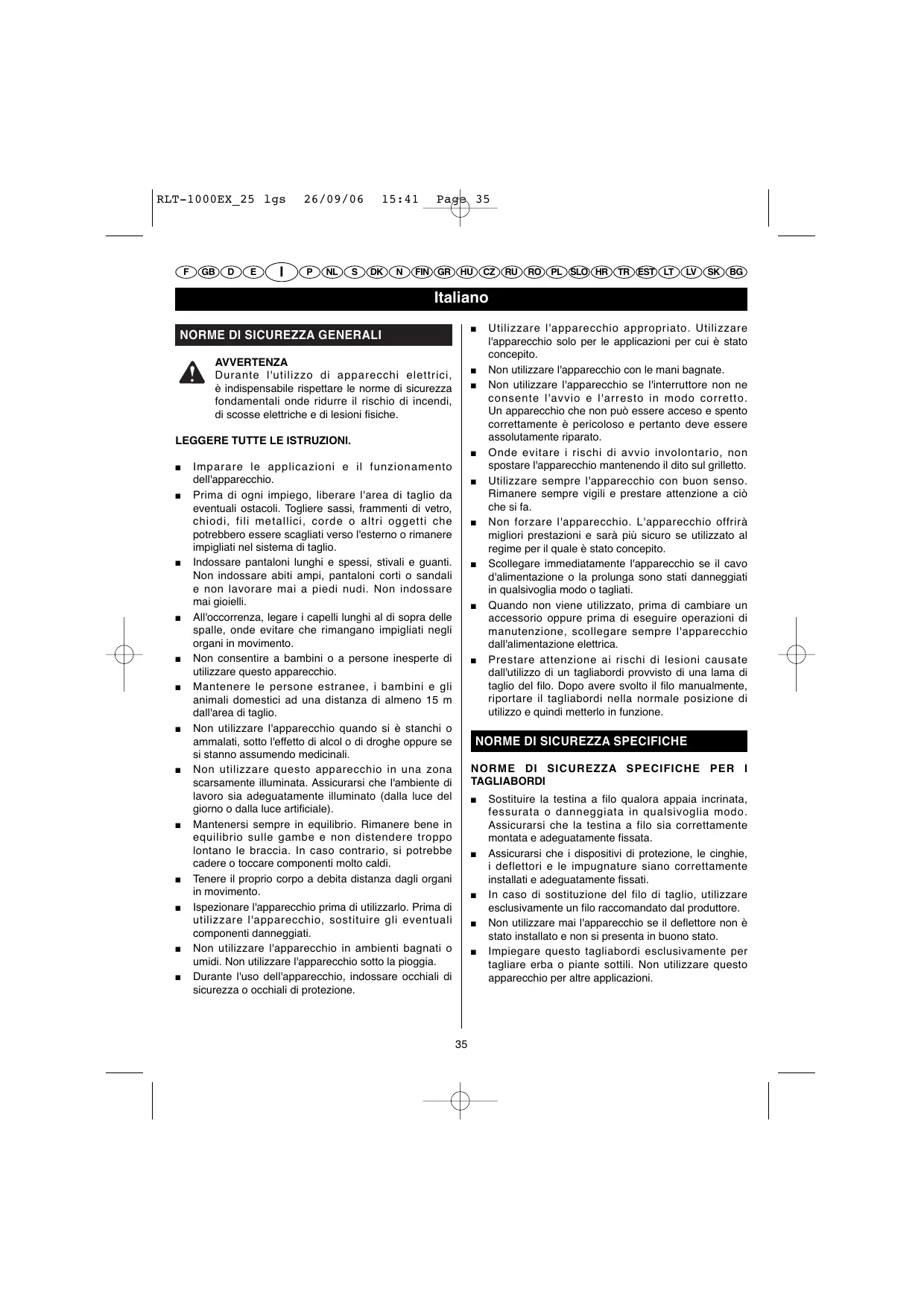 Cuando utilice el cortabordes, sosténgalo siempre recto. Mantenga siempre las manos alejadas del hilo de corte. No trate de retirar o sostener el material cortado cuando el hilo de corte esté en movimiento. Desenchufe la herramienta antes de limpiar la cabeza para hilo de corte. No sostenga ni traslade la herramienta por el hilo de corte. Tenga cuidado después de parar la herramienta: el hilo sigue girando unos segundos por inercia. No ponga en marcha el aparato en lugares cerrados o mal ventilados, o cerca de substancias inflamables y/o explosivas como líquidos, gases y polvos. No cruce una carretera o un camino con el cortabordes encendido. No instale jamás una hoja en el cortabordes. Cerciórese de que la red eléctrica está equipada con un disyuntor que se dispara al superar los 30 mA.