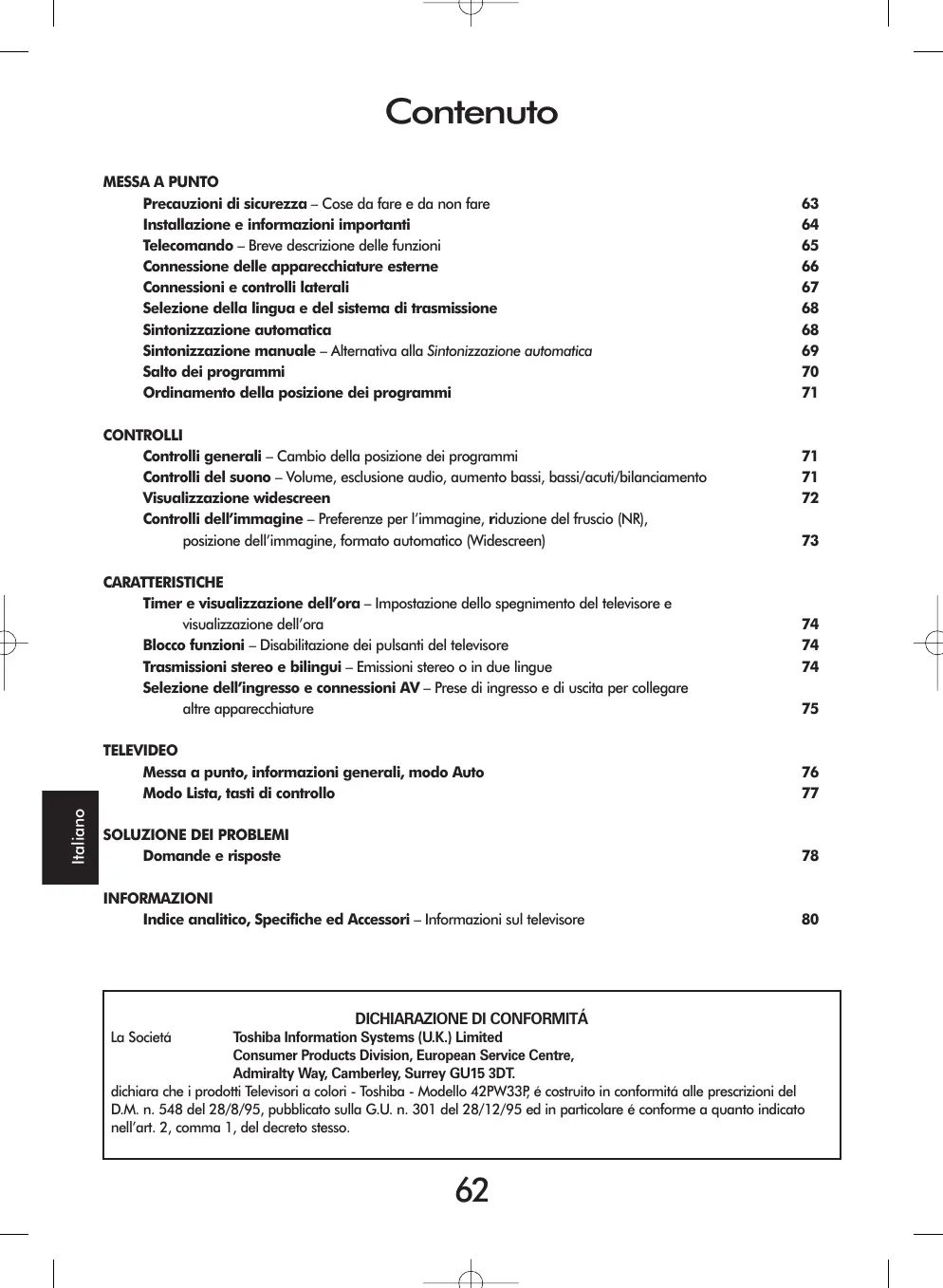 Toshiba Information Systems (U.K.) Limited Consumer Products Division, European Service Centre, Admiralty Way, Camberley, Surrey GU15 3DT. dichiara che i prodotti Televisori a colori - Toshiba - Modello 42PW33P, é costruito in conformitá alle prescrizioni del D.M. n. 548 del 28/8/95, pubblicato sulla G.U. n. 301 del 28/12/95 ed in particolare é conforme a quanto indicato nell’art. 2, comma 1, del decreto stesso.