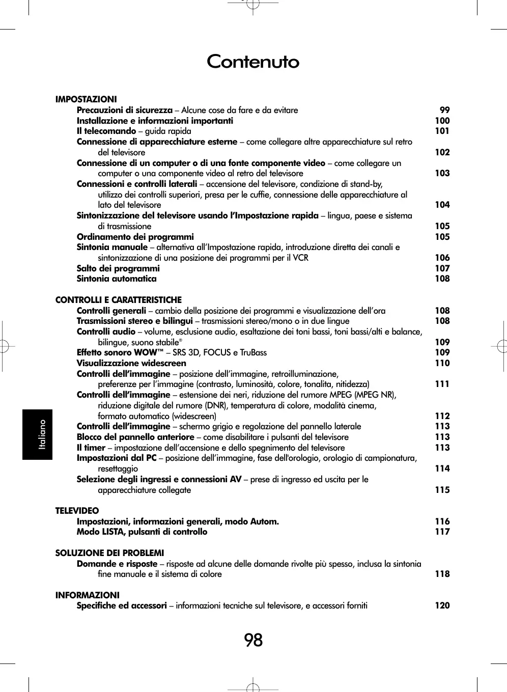 CONTROLLI E CARATTERISTICHE Controlli generali – cambio della posizione dei programmi e visualizzazione dell’ora Trasmissioni stereo e bilingui – trasmissioni stereo/mono o in due lingue Controlli audio – volume, esclusione audio, esaltazione dei toni bassi, toni bassi/alti e balance, bilingue, suono stabile® Effetto sonoro WOW™ – SRS 3D, FOCUS e TruBass Visualizzazione widescreen Controlli dell’immagine – posizione dell’immagine, retroilluminazione, preferenze per l’immagine (contrasto, luminosità, colore, tonalita, nitidezza) Controlli dell’immagine – estensione dei neri, riduzione del rumore MPEG (MPEG NR), riduzione digitale del rumore (DNR), temperatura di colore, modalità cinema, formato automatico (widescreen) Controlli dell’immagine – schermo grigio e regolazione del pannello laterale Blocco del pannello anteriore – come disabilitare i pulsanti del televisore Il timer – impostazione dell’accensione e dello spegnimento del televisore Impostazioni dal PC – posizione dell’immagine, fase dell'orologio, orologio di campionatura, resettaggio Selezione degli ingressi e connessioni AV – prese di ingresso ed uscita per le apparecchiature collegate