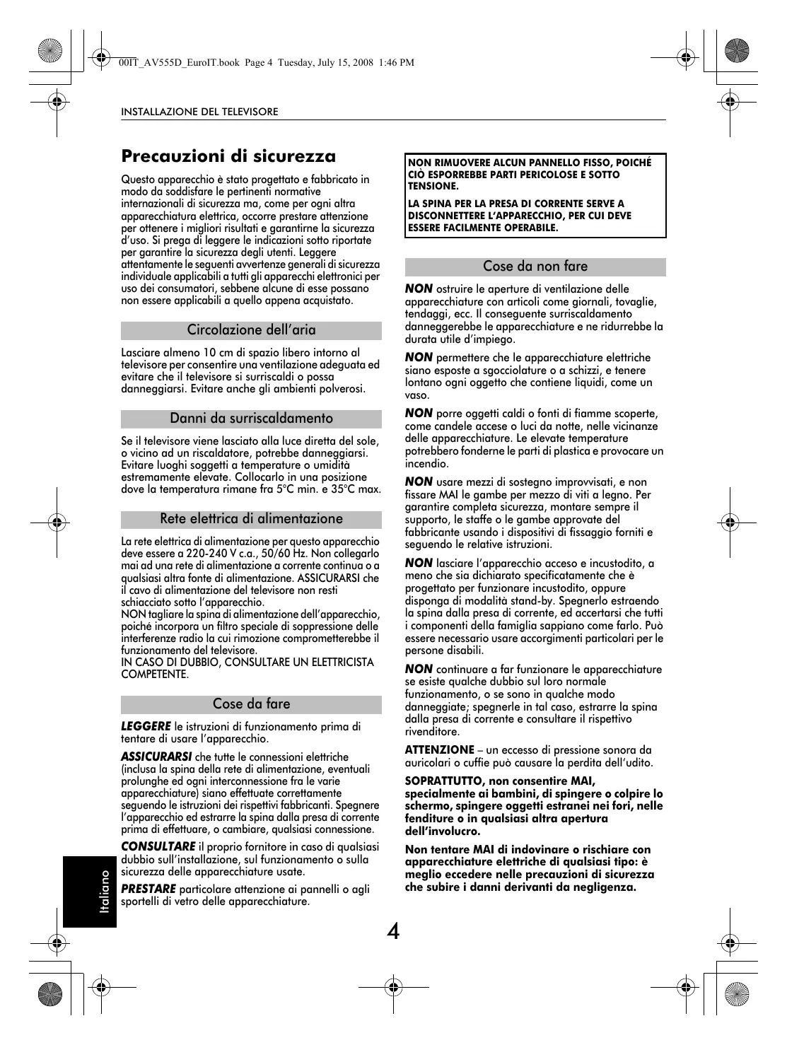 00IT_AV555D_EuroIT.book Page 4 Tuesday, July 15, 2008 1:46 PM INSTALLAZIONE DEL TELEVISORE Precauzioni di sicurezza