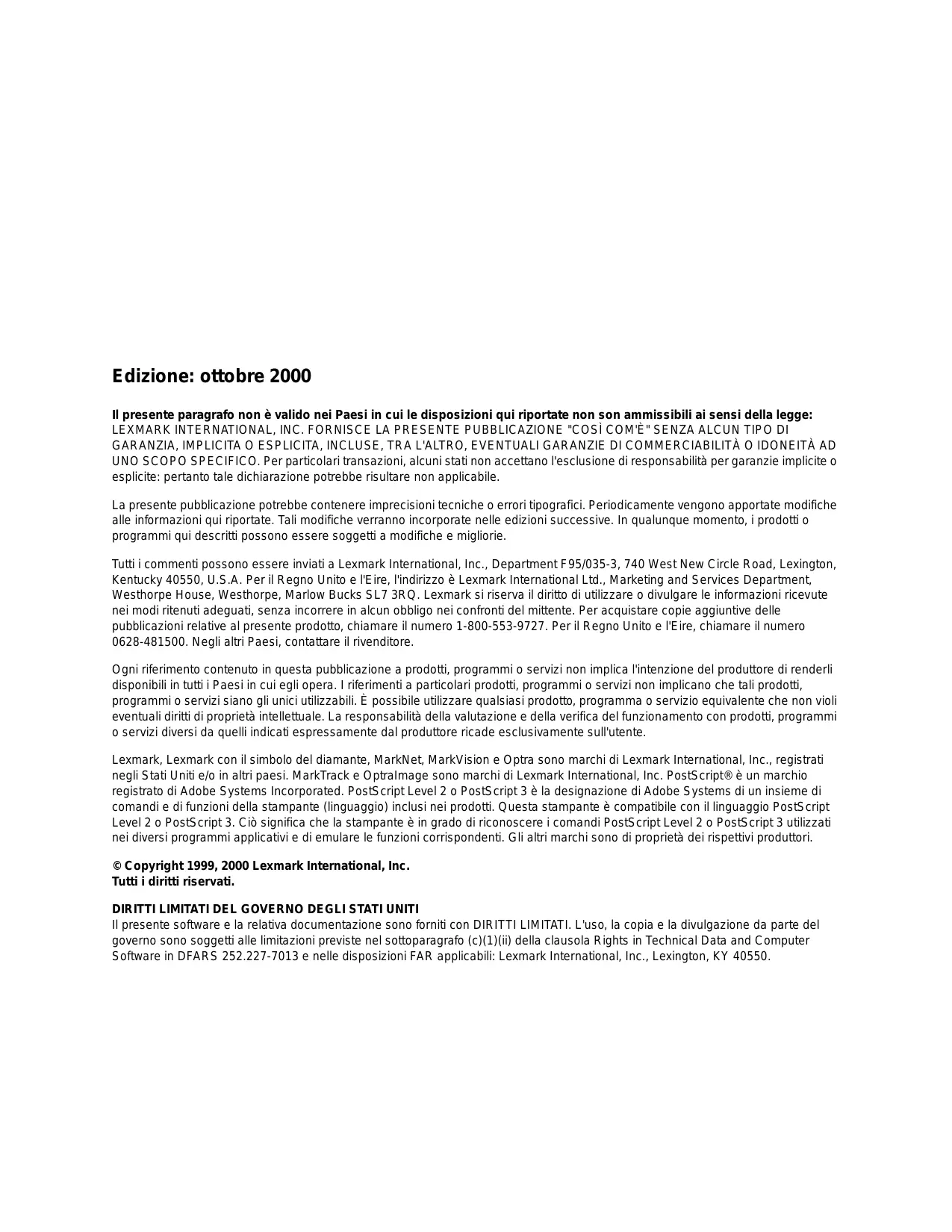 Edizione: ottobre 2000 Il presente paragrafo non è valido nei Paesi in cui le disposizioni qui riportate non son ammissibili ai sensi della legge: LEXMARK INTERNATIONAL, INC. FORNISCE LA PRESENTE PUBBLICAZIONE "COSÌ COM'È" SENZA ALCUN TIPO DI GARANZIA, IMPLICITA O ESPLICITA, INCLUSE, TRA L'ALTRO, EVENTUALI GARANZIE DI COMMERCIABILITÀ O IDONEITÀ AD UNO SCOPO SPECIFICO. Per particolari transazioni, alcuni stati non accettano l'esclusione di responsabilità per garanzie implicite o esplicite: pertanto tale dichiarazione potrebbe risultare non applicabile. La presente pubblicazione potrebbe contenere imprecisioni tecniche o errori tipografici. Periodicamente vengono apportate modifiche alle informazioni qui riportate. Tali modifiche verranno incorporate nelle edizioni successive. In qualunque momento, i prodotti o programmi qui descritti possono essere soggetti a modifiche e migliorie. Tutti i commenti possono essere inviati a Lexmark International, Inc., Department F95/035-3, 740 West New Circle Road, Lexington, Kentucky 40550, U.S.A. Per il Regno Unito e l'Eire, l'indirizzo è Lexmark International Ltd., Marketing and Services Department, Westhorpe House, Westhorpe, Marlow Bucks SL7 3RQ. Lexmark si riserva il diritto di utilizzare o divulgare le informazioni ricevute nei modi ritenuti adeguati, senza incorrere in alcun obbligo nei confronti del mittente. Per acquistare copie aggiuntive delle pubblicazioni relative al presente prodotto, chiamare il numero 1-800-553-9727. Per il Regno Unito e l'Eire, chiamare il numero 0628-481500. Negli altri Paesi, contattare il rivenditore. Ogni riferimento contenuto in questa pubblicazione a prodotti, programmi o servizi non implica l'intenzione del produttore di renderli disponibili in tutti i Paesi in cui egli opera. I riferimenti a particolari prodotti, programmi o servizi non implicano che tali prodotti, programmi o servizi siano gli unici utilizzabili. È possibile utilizzare qualsiasi prodotto, programma o servizio equivalente che non violi eventuali diritti di proprietà intellettuale. La responsabilità della valutazione e della verifica del funzionamento con prodotti, programmi o servizi diversi da quelli indicati espressamente dal produttore ricade esclusivamente sull'utente. Lexmark, Lexmark con il simbolo del diamante, MarkNet, MarkVision e Optra sono marchi di Lexmark International, Inc., registrati negli Stati Uniti e/o in altri paesi. MarkTrack e OptraImage sono marchi di Lexmark International, Inc. PostScript® è un marchio registrato di Adobe Systems Incorporated. PostScript Level 2 o PostScript 3 è la designazione di Adobe Systems di un insieme di comandi e di funzioni della stampante (linguaggio) inclusi nei prodotti. Questa stampante è compatibile con il linguaggio PostScript Level 2 o PostScript 3. Ciò significa che la stampante è in grado di riconoscere i comandi PostScript Level 2 o PostScript 3 utilizzati nei diversi programmi applicativi e di emulare le funzioni corrispondenti. Gli altri marchi sono di proprietà dei rispettivi produttori. © Copyright 1999, 2000 Lexmark International, Inc. Tutti i diritti riservati. DIRITTI LIMITATI DEL GOVERNO DEGLI STATI UNITI Il presente software e la relativa documentazione sono forniti con DIRITTI LIMITATI. L'uso, la copia e la divulgazione da parte del governo sono soggetti alle limitazioni previste nel sottoparagrafo (c)(1)(ii) della clausola Rights in Technical Data and Computer Software in DFARS 252.227-7013 e nelle disposizioni FAR applicabili: Lexmark International, Inc., Lexington, KY 40550. OptraImage Guida all'installazione Italiano Per l'uso con OptraImage 242/232 Informazioni sulla sicurezza - - - - - - - -140 Installazione della stampante - - - - - - - -141 Installazione del server di stampa MarkNet -142 Rilascio del dispositivo di blocco - - - - - -143 Installazione del vassoio di alimentazione e del fermo carta - - - - - - - - - - - - -144 Collegamento dei cavi - - - - - - - - - - -145 Accensione delle unità di scansione e della stampante - - - - - - - - - - - - - - - -148 Assegnazione di un indirizzo di rete- - - - -150 Selezione delle impostazioni di copia predefinite - - - - - - - - - - - - - - -152 Impostazione per l’invio e la ricezione di fax 154 Impostazione della scansione verso rete - -158 Verifica dell'impostazione- - - - - - - - - -161 Distribuzione delle istruzioni per OptraImage 162 Risoluzione dei problemi di impostazione - -163 Manutenzione dello scanner - - - - - - - -164 Avvertenze- - - - - - - - - - - - - - - - -167 OptraImage Setup Guide