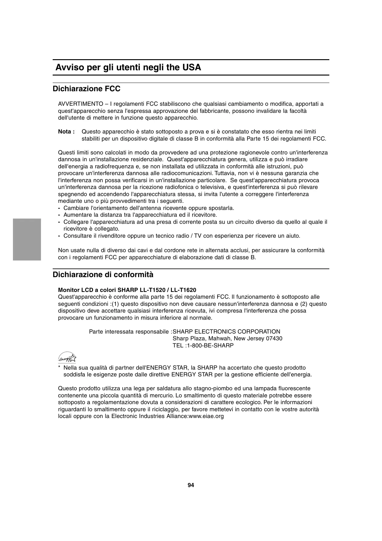 Dichiarazione di conformità Monitor LCD a colori SHARP LL-T1520 / LL-T1620 Quest'apparecchio è conforme alla parte 15 dei regolamenti FCC. Il funzionamento è sottoposto alle seguenti condizioni :(1) questo dispositivo non deve causare nessun'interferenza dannosa e (2) questo dispositivo deve accettare qualsiasi interferenza ricevuta, ivi compresa l'interferenza che possa provocare un funzionamento in misura inferiore al normale. Parte interessata responsabile :SHARP ELECTRONICS CORPORATION Sharp Plaza, Mahwah, New Jersey 07430 TEL :1-800-BE-SHARP